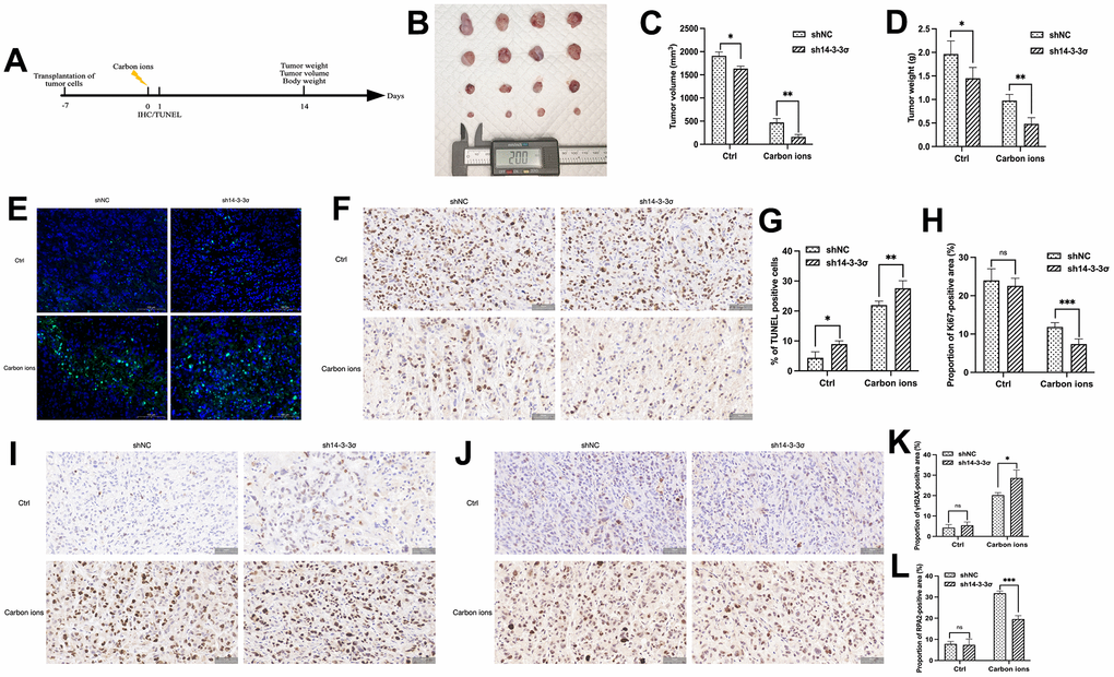 The above results demonstrated that 14-3-3σ promoted carbon ion radioresistance by hindering the HRR pathway. We constructed the stably 14-3-3σ-deficient cells using lentivirus containing 14-3-3σ short hairpin RNA (shRNA) (Supplementary Figure 2A–2C) to study the effect of 14-3-3σ on carbon ion irradiation in vivo. We generated subcutaneous PAAD xenograft models using AsPC-1 cells (Figure 9A). As depicted in Figure 9B–9D, the sh14-3-3σ group inhibited xenografts in terms of size, weight, and volume, and the inhibition was more significant than that following carbon ion irradiation. This was in line with the in vitro outcomes. The Ki67 IHC and terminal deoxynucleotidyl transferase dUTP nick end labeling (TUNEL) IF staining were performed to detect the proliferation and apoptosis rate of tumor cells. Tumors derived from sh14-3-3σ group displayed fewer proliferating cells (NC group: 24.00%±3.02%, sh14-3-3σ group: 22.58%±1.99%, carbon ion group: 11.83%±1.15%, combination group: 7.40%±1.33%) (Figure 9E, 9G), and more cell apoptosis (NC group: 4.40%±1.99%, sh14-3-3σ group: 8.95%±1.05%, carbon ion group: 21.97%±1.30%, combination group: 27.62%±2.47%) (Figure 9F, 9H). In addition, the combination group owned more γH2AX-positive cells, a marker of unrepaired DNA damage, than the carbon ion irradiation one (Figure 9I, 9K). Finally, we detected RPA2-positive cells and found that sh14-3-3σ reduced the carbon-induced number of RPA2-positive cells (Figure 9J, 9L). The above outcomes indicated that 14-3-3σ depletion suppressed RPA2 expression, thus inhibiting cell proliferation to facilitate carbon ion radiosensitivity of PAAD cells in vivo.