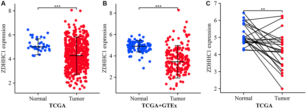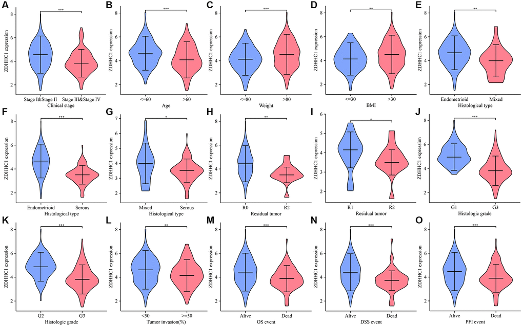 We performed an expression analysis of unmatched and paired normal and UCEC tissues to explore ZDHHC1 expression in UCEC. We also matched ZDHHC1 expression data with clinical data of patients with UCEC and eliminated any missing information. Subsequently, we grouped the patients according to their clinical characteristics and examined the expression levels of ZDHHC1 in UCEC tissues.