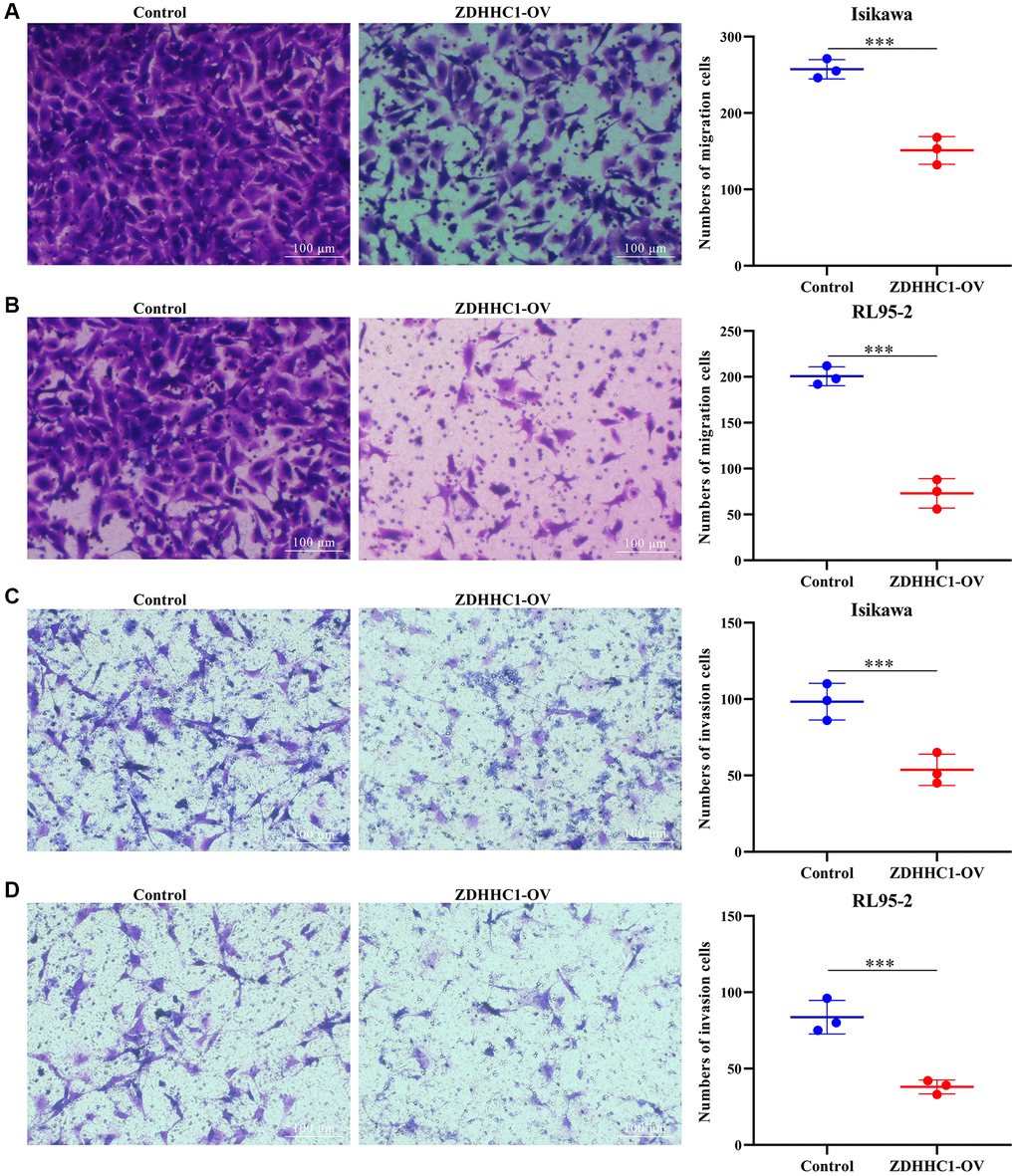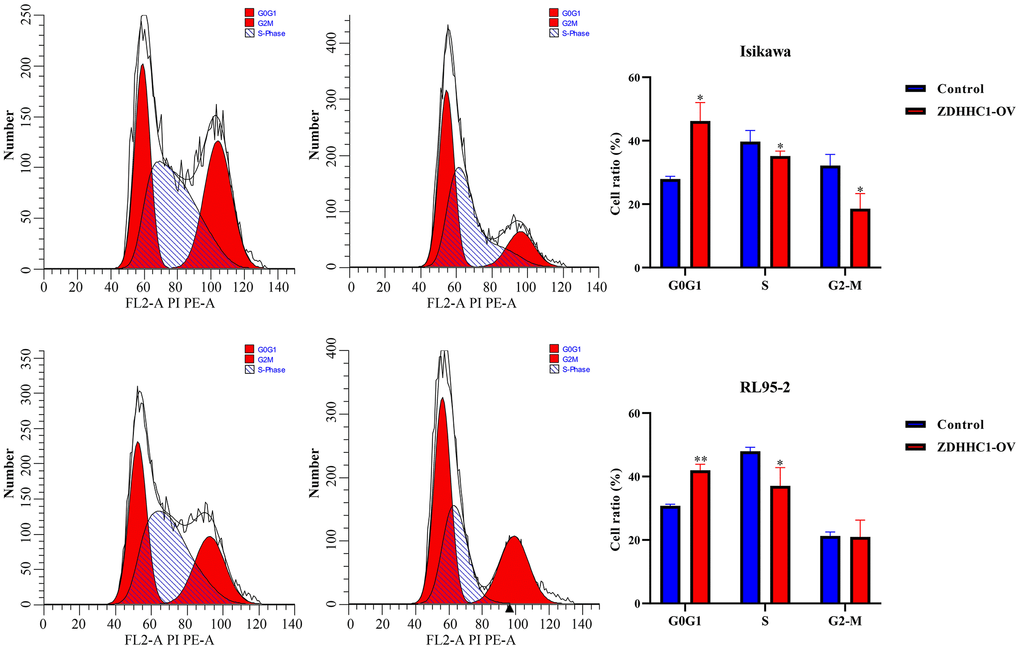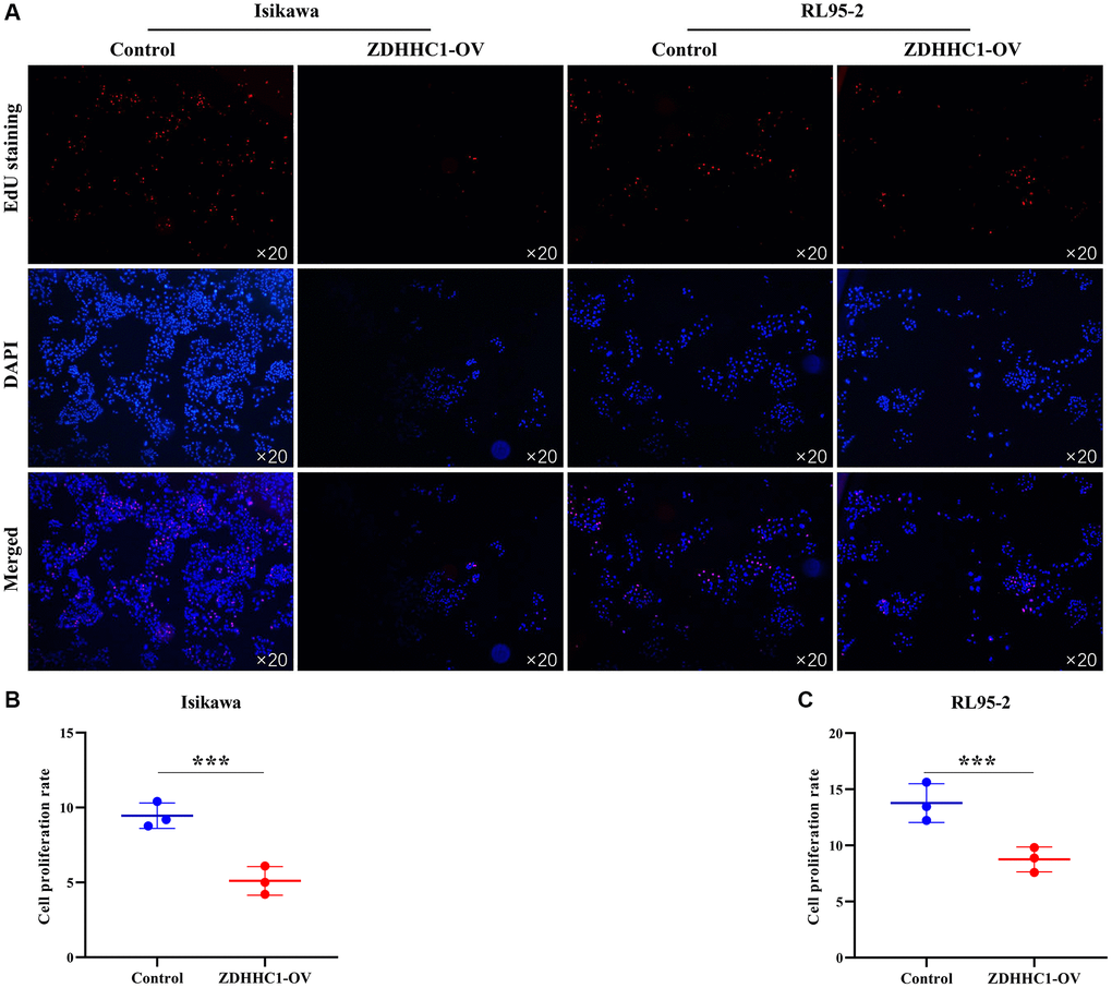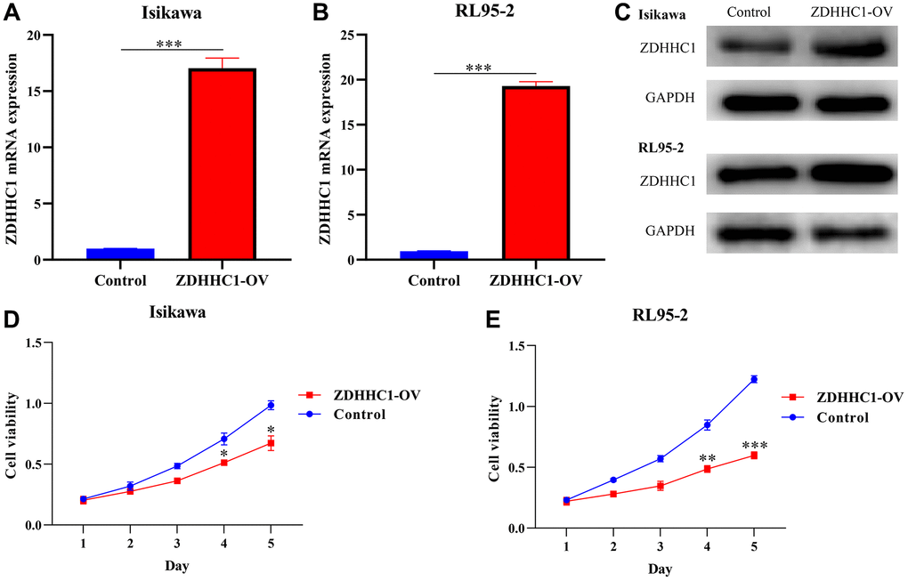 Endometrial carcinoma Ishikawa cells and endometrial adenosquamous carcinoma RL95-2 cells were purchased from the Typical Culture Collection Center in the United States or the European Collection Center. Ishikawa cells were cultured in Minimum Essential Medium (MEM) containing 5% fetal bovine serum, and RL95-2 cells were cultured in Dulbecco’s modified Eagle medium/Nutrient Mixture F-12 (DMEM/F-12) medium containing 10% fetal bovine serum. The culture conditions for all cells were 5% CO2 and 37°C. The ZDHHC1 overexpression (ZDHHC1-OV) and empty control (Control) vectors were purchased from Youbao Biotechnology. Ishiwaka and RL95-2 cells were transfected with the vectors following the manufacturer’s instructions. The target gene sequence of ZDHHC1 was ENSG0000159714.