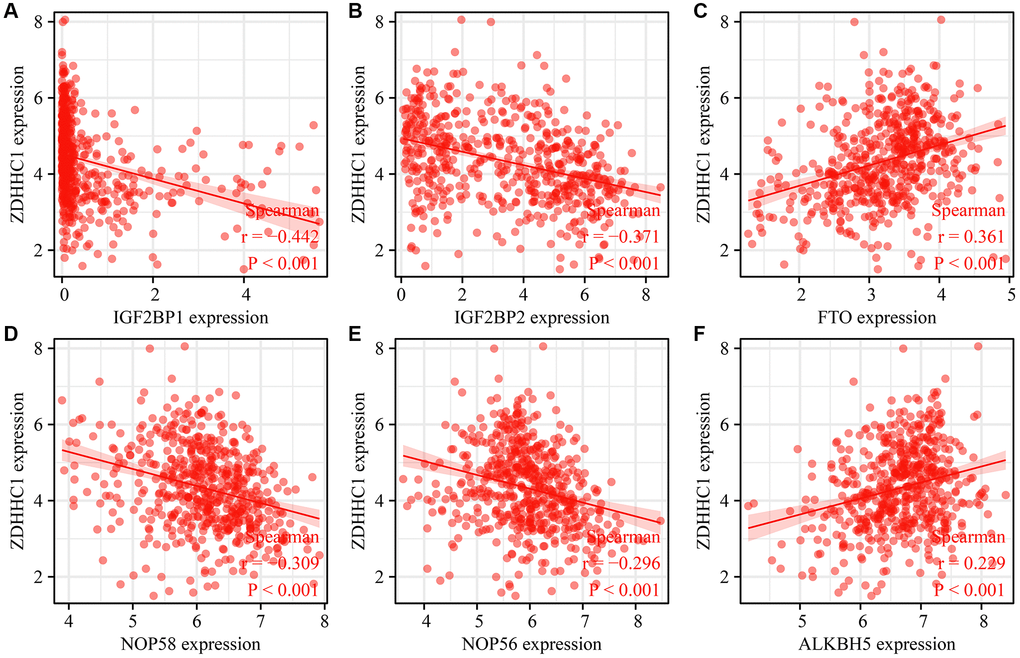 The relationship between genes and RNA modifications was investigated using the RM2Target database. Genes encoding RNA-modifying enzymes (hereafter RNA modification genes) related to ZDHHC1 were identified from the RM2TARGET database. Based on these findings, the correlation between ZDHHC1 and RNA modification gene expression was determined: ADAR, ADARB1, ALKBH1, ALKBH5, ALYREF, DKC1, ELAVL1, FBL, FTO, HNRNP2B1, HNRNPC, IGF2BP1, IGF2BP2, LRPPRC, METTL1, METTL14, METTL3, METTL5, NOP56, NOP58, PCIF1, PUS7, RBMX, WDR4, WTAP, YBX1, YTHDC1, YTHDC2, YTHDF1, YTHDF2, YTHDF3, ZC3H13, and ZCCHC4.
