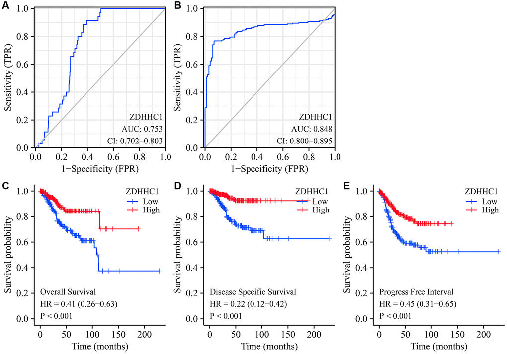 The results of ROC analysis revealed that decreased ZDHHC1 expression was significantly indicative of diagnosing UCEC (Figure 3A, 3B). Specifically, when using the TCGA database, the AUC for ZDHHC1 was 0.753 (Figure 3A), and when also using the Xena database, the AUC was 0.848 (Figure 3B). Moreover, a Kaplan-Meier survival analysis demonstrated that decreased ZDHHC1 expression was a significant prognostic factor for UCEC (Figure 3C–3E). Specifically, reduced ZDHHC1 expression was associated with shorter OS (HR = 0.41; P < 0.001), disease-specific survival (DSS) (HR = 0.22; P < 0.001), and progression-free interval (PFI) (HR = 0.45; P < 0.001) in patients diagnosed with UCEC.