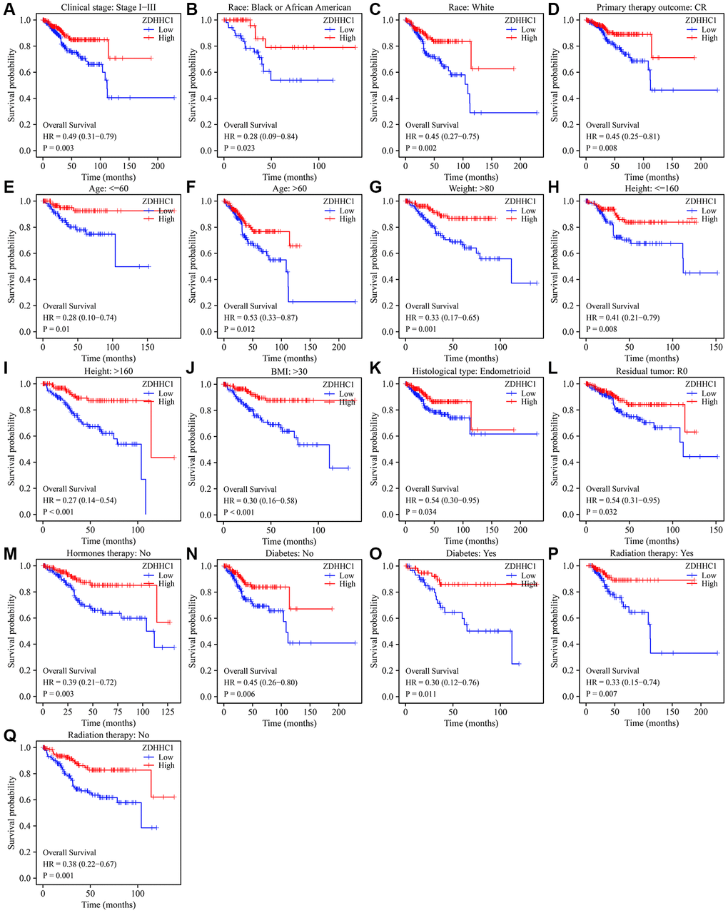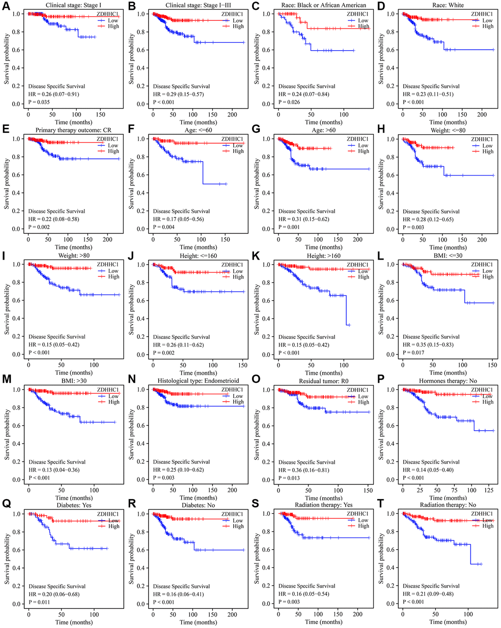 A Kaplan-Meier survival analysis revealed that decreased ZDHHC1 expression significantly correlated with shorter OS among patients with the following features: clinical stage I–III, complete response (CR), residual tumor (R0), histological type of endometrioid, Black or African American, white, age ≤60, age >60, weight >80, height ≤160 cm, height >160 cm, BMI >30, with or without diabetes, no hormone therapy, and with or without radiation therapy (Figure 4). Furthermore, decreased ZDHHC1 expression significantly correlated with shorter DSS among patients with the following characteristics: clinical stage I or I–III, CR, R0, histological type of endometrioid, Black or African American, white, age ≤60, age >60, weight ≤80, weight >80, height ≤160 cm, height >160 cm, BMI ≤30, BMI >30, with or without diabetes, no hormone therapy, and with or without radiation therapy (Figure 5). Reduced ZDHHC1 expression also correlated with shorter PFI among patients with the following properties: clinical stage I or I–III, CR, R0, histological type of endometrioid, Black or African American, white, age ≤60, age >60, weight >80, height ≤160 cm, height >160 cm, BMI >30, with or without diabetes, no hormone therapy, and with or without radiation therapy (Supplementary Figure 1).