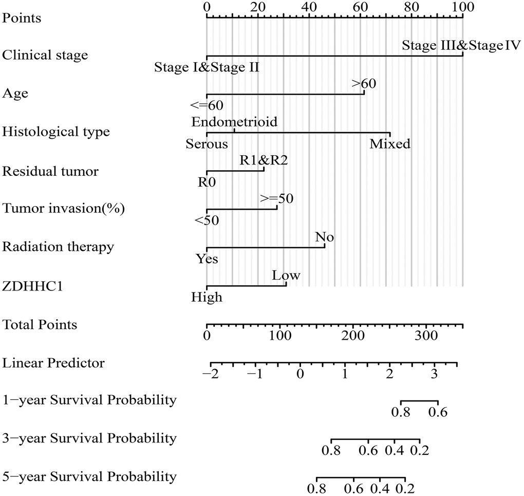 A Cox regression analysis indicated that several factors, including clinical stage, age, histological subtype, residual tumor, tumor invasion, and ZDHHC1 expression, were associated with a reduced OS among patients with UCEC (Table 1). Similarly, clinical stage, histological subtype, residual tumor, tumor invasion, and ZDHHC1 expression were significantly associated with a shorter DSS and PFI in the patients (Tables 2 and 3). We also constructed nomograms based on ZDHHC1 expression and prognostic indicators of OS, DSS, and PFI using Cox regression results and provided a comprehensive assessment of patient outcomes (Figure 6 and Supplementary Figure 2).