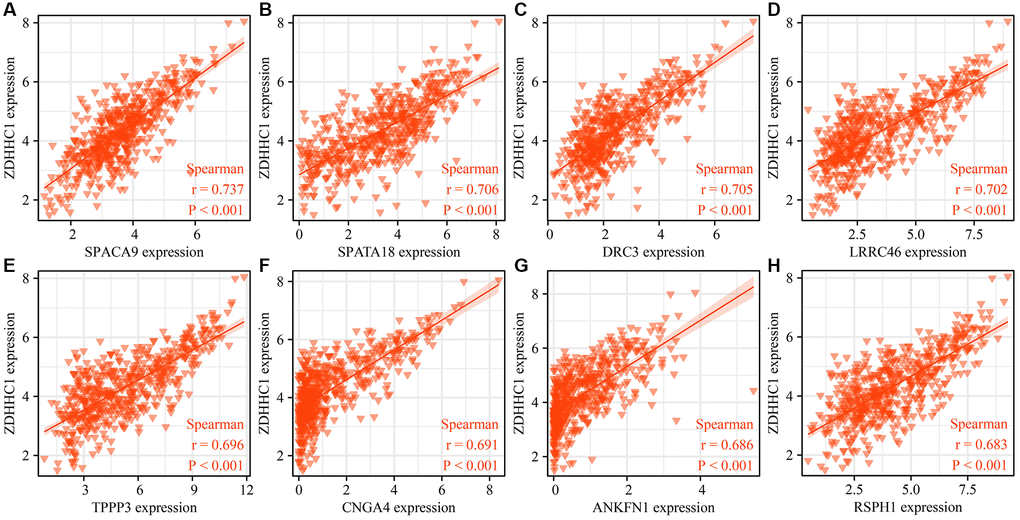 RNA modification genes were extracted from the RM2Target database, and ZDHHC1 expression significantly correlated with the expression levels of several RNA modification genes: IGF2BP1 (P < 0.001), IGF2BP2 (P < 0.001), FTO (P < 0.001), NOP58 (P < 0.001), NOP56 (P < 0.001), ALKBH5 (P < 0.001), DKC1 (P < 0.001), LRPPRC (P < 0.001), METTL1 (P < 0.001), METTL5 (P < 0.001), YBX1 (P < 0.001), ADARB1 (P < 0.001), YTHDF1 (P < 0.001), ELAVL1 (P < 0.001), YTHDC2 (P < 0.001), WTAP (P < 0.001), ALYREF (P = 0.001), FBL (P = 0.006), ZCCHC4 (P = 0.006), YTHDF3 (P = 0.009), and PCIF1 (P = 0.025) (Figure 15 and Table 7).
