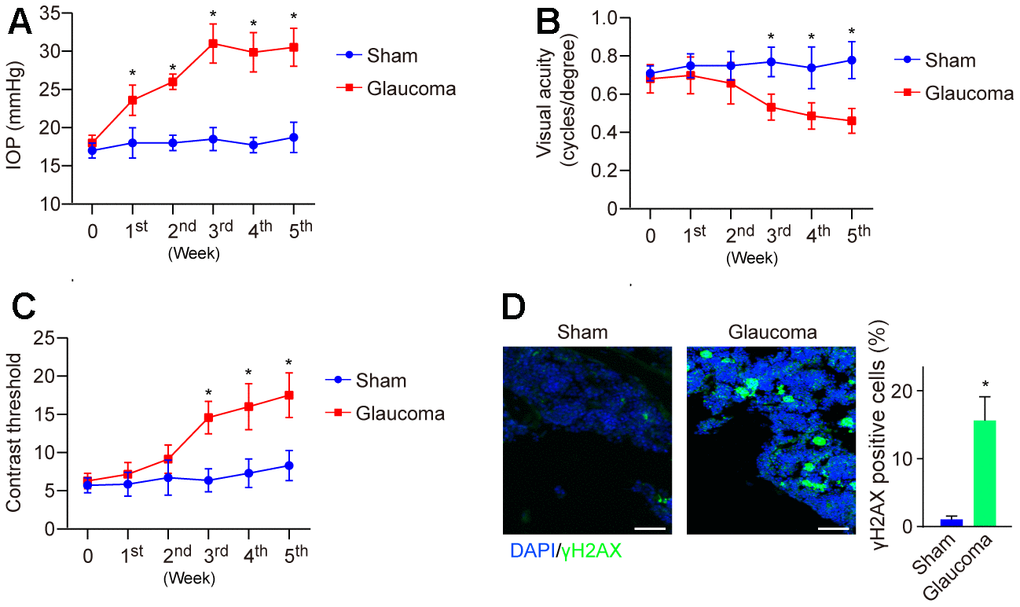 Glaucoma is a degenerative disease characterized by the loss of RGCs that can be triggered by multiple factors, such as DNA damage [19]. Here, to study the role of DNA damage in the pathogenesis of glaucoma, we generated an experimental model of glaucoma by using hypertonic saline (HS) injection as reported previously [16]. After injection, IOP was dynamically monitored weekly and showed that IOP was gradually elevated and reached a peak in the 3rd week as compared to the sham group (Figure 1A). Visual function was also impaired (Figure 1B, 1C). Subsequently, the mice were sacrificed at the end of the 5th week, and the retina was collected and subjected to immunofluorescence (IF) to detect DNA damage. We found that the level of γH2AX, a DNA damage marker, was significantly elevated in the glaucoma group compared with the sham group (Figure 1D). The data demonstrated increased DNA damage in glaucoma.
