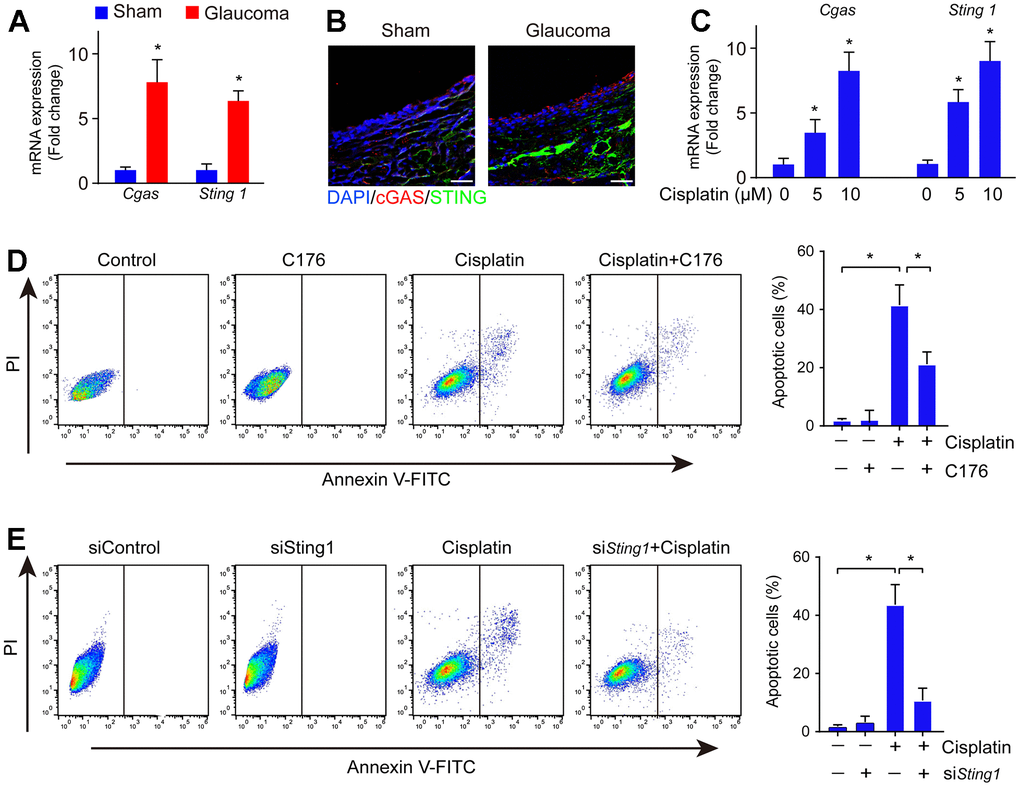 The cGAS-STING pathway implicates DNA damage sensing [20]. To explore whether cGAS-STING signaling is involved in the pathology of glaucoma, we investigated the mRNA expression of cGAS and STING and found that cGAS and STING were significantly upregulated in the glaucoma retina (Figure 2A). Consistently, its protein expression was also highly expressed in the glaucoma group (Figure 2B). Glaucoma is associated with RGC loss leading to eventual visual dysfunction. Next, we investigated if cGAS-STING signaling mediated RGC loss in vitro. Firstly, cell line RGC-5 was treated with cisplatin to reassembly induce DNA damage, followed by treatment with STING inhibitor C176 to inhibit cGAS-STING signaling activity. We found treatment with cisplatin induced DNA damage as well as activation of the cGAS-STING signaling in RGC cells (Figure 2C). The addition of cGAS-STING signaling inhibitor C176 significantly reversed cisplatin-induced RGC cell apoptosis (Figure 2D). Moreover, genetic inhibition of STING significantly abrogated cisplatin-induced RGC cell apoptosis (Figure 2E). The data highlight the crucial role of cGAS-STING in regulating DNA damage-induced cell death in RGC.