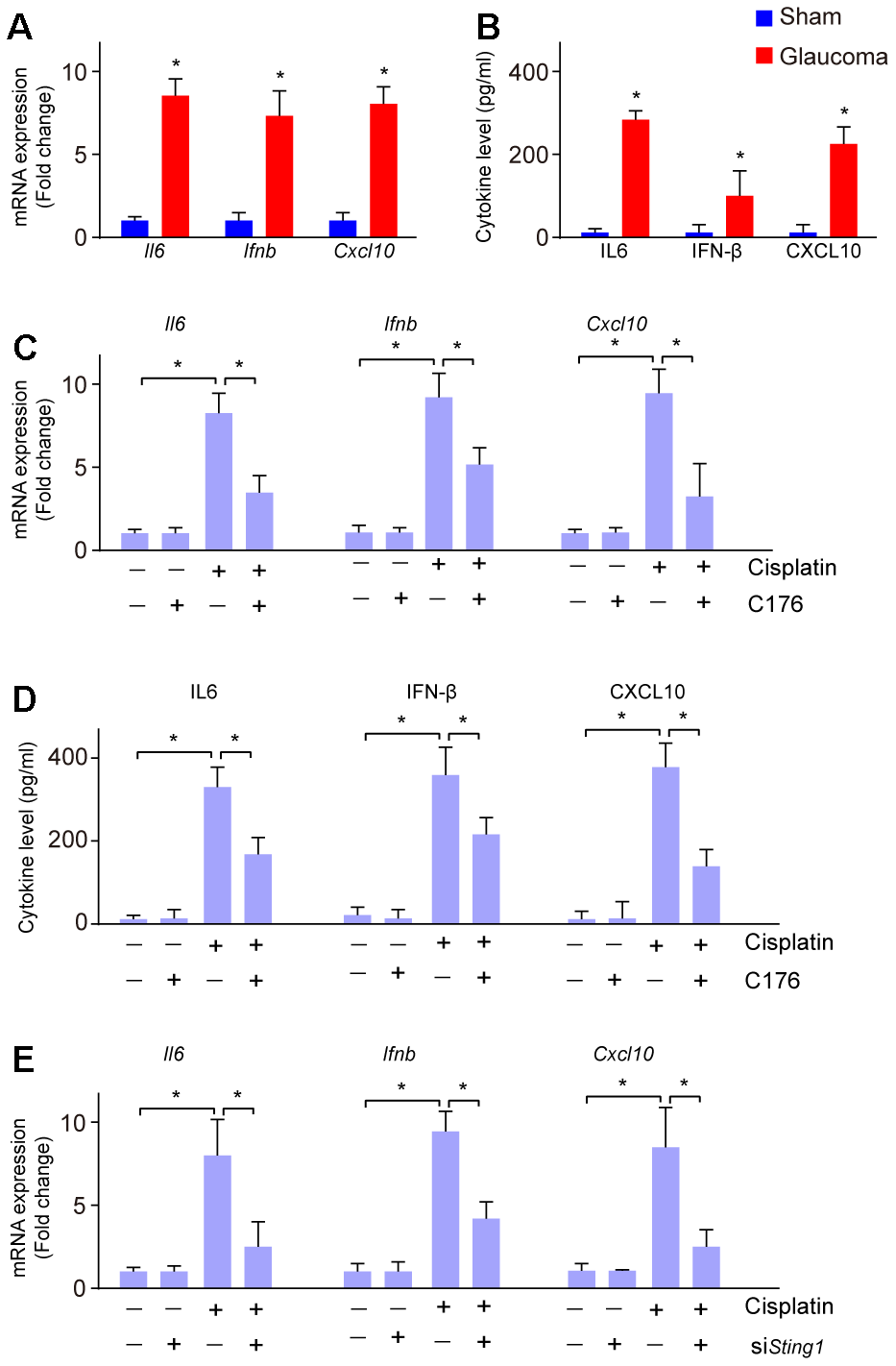 Activation of cGAS-STING also leads to the intracellular inflammatory response [21]. Next, we investigated whether the inflammatory response was increased in glaucoma. We found the mRNA expression of cGAS-STING signaling downstream genes Il6, Ifnb, and Cxcl10 were increased in glaucoma as compared to the sham group (Figure 3A). Moreover, ELISA analysis showed the level of IL-6, IFN-β, and CXCL10 were also elevated in glaucoma as compared to the sham group (Figure 3B), suggesting an inflammatory response in glaucoma. To uncover whether the inflammatory response is associated with the activation of cGAS-STING signaling in vitro, RGC-5 cells were treated with cisplatin, followed by treatment with C176. C176 significantly restored cisplatin-induced increased mRNA expression of Il6, Ifnb, and Cxcl10 (Figure 3C). Moreover, the amount of the secreted IL-6, IFN-β, and CXCL10 were also repressed by C176 treatment (Figure 3D). Genetic inhibition of cGAS-STING also remarkably reversed cisplatin-induced increased mRNA expression of Il6, Ifnb, and Cxcl10 (Figure 3E).
