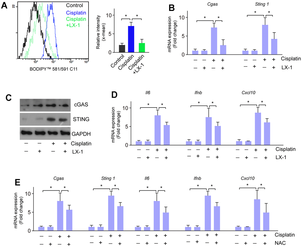 Next, we investigated whether the activation of cGAS-STING induced by cisplatin is regulated through lipid oxidation. RGC-5 cells were treated with cisplatin, followed by treatment with lipid oxidation inhibitor liproxstatin-1 (LX-1), and N-acetyl-l-cysteine (NAC), respectively. Cisplatin treatment induced lipid oxidation, which is markedly restored by LX-1 pretreatment (Figure 4A). LX-1 also alleviated cisplatin-induced activation of cGAS-STING signaling as well as the downstream gene expression (Figure 4B–4D). Similarly, treatment with NAC also reversed restored cisplatin-induced activation of cGAS-STING signaling and downstream gene expression of Il6, Ifnb, and Cxcl10 (Figure 4E). These data imply that lipid peroxidation is linked to cisplatin-induced cGAS-STING activation.