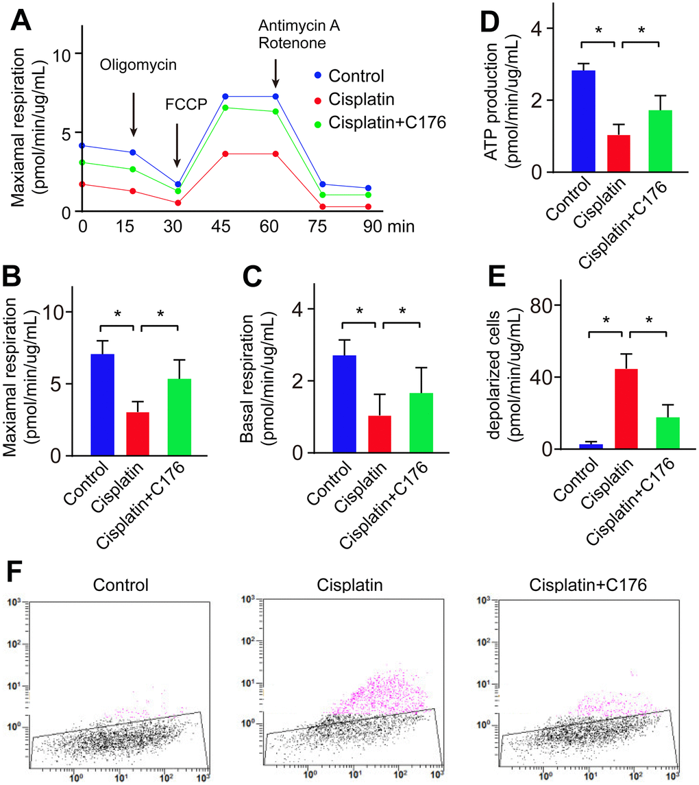 It reported that activation of cGAS-STING-induced inflammatory response linked to the mitochondrial functional defect. To address the mechanism by which activation of the cGAS-STING pathway in cisplatin-induced RGC inflammation, we focused on the link between the cGAS-STING pathway and mitochondrial damage. We found cisplatin indeed impaired mitochondrial respiration ability and mitochondrial ATP production (Figure 5A–5D). Next, we investigated the change of mitochondrial membrane potential, as it is depolarized when mitochondrial dysfunction. We found mitochondrial membrane potential was significantly reduced, manifested by the increased percentage of depolarized cells (Figure 5E, 5F). C176 treatment significantly rescued mitochondrial respiration ability, mitochondrial ATP production and mitochondrial membrane potential depolarization (Figure 5A–5F).