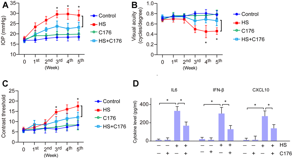 To confirm the effect of the cGAS-STING pathway on the progression of glaucoma, we utilized STING inhibitor C176 to treat HS-induced glaucoma. We found that C176 treatment exhibited no remarkable effects on normal IOP and visual function, but significantly attenuated HS-induced visual dysfunction and increased IOP as compared to control mice (Figure 6A–6C). We next investigated if this effect was associated with the inflammatory response. We found this alleviating effect was accompanied by a decrease in pro-inflammatory molecule expression (Figure 6D). Our data demonstrate that suppression of cGAS-STING represents a promising way to ameliorate retinal inflammation and protect visual function in glaucoma.