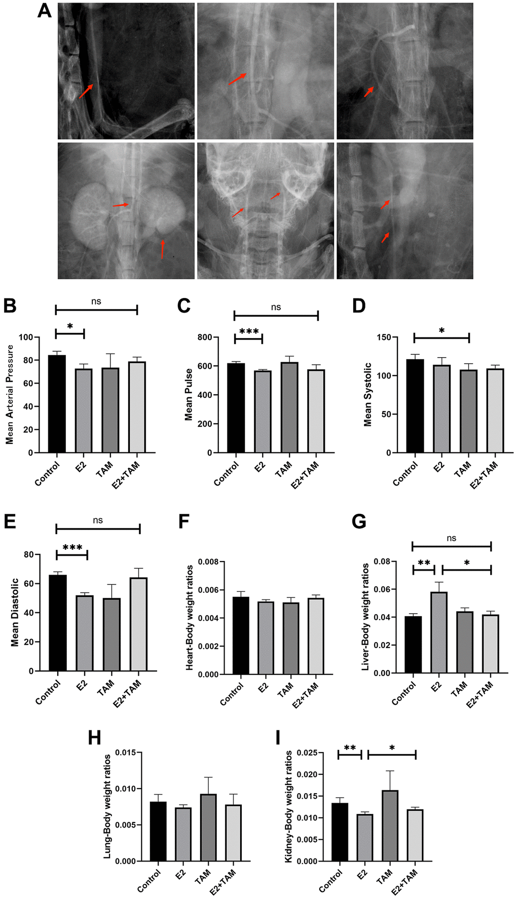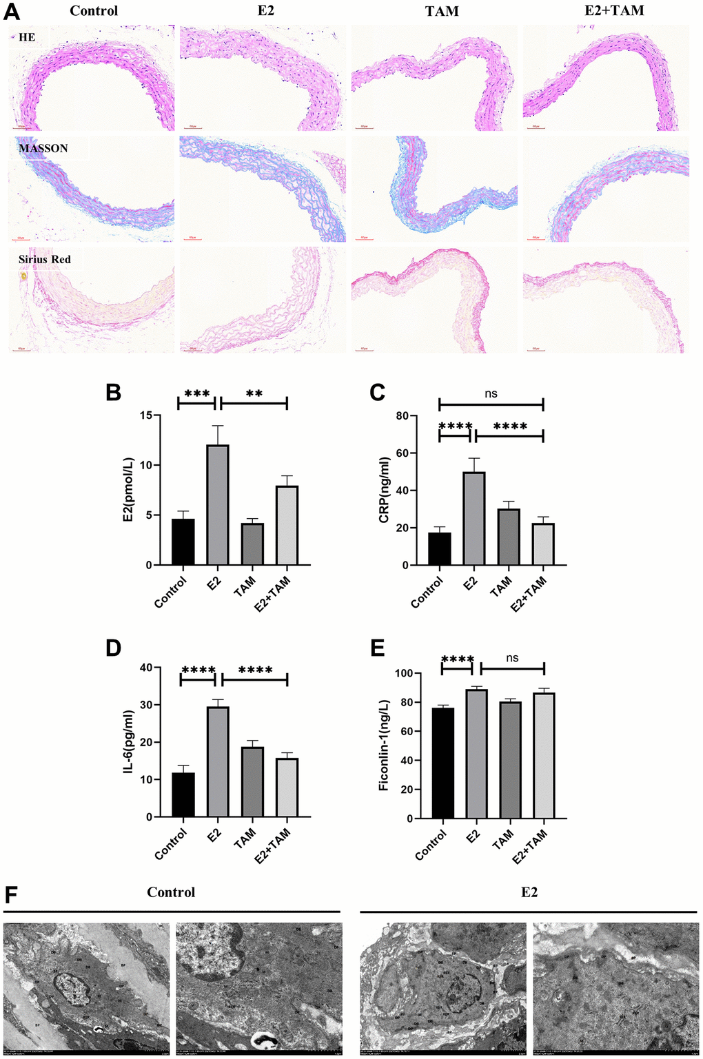 TAM antagonizes the effect of E2 by binding to ESR1. In the mouse model of polyarteritis, TAM ameliorated the E2-induced attenuation of mean arterial pressure and slowing of pulse rate in the tail artery of mice (Figure 1B–1E). Regarding the organ/body weight wet weight ratio, TAM treatment alone, which had no significant effect on organ weight in mice, attenuated the E2-induced weight gain of the liver and did not show E2-induced kidney atrophy (Figure 1F–1I). In addition, TAM reduced the high estrogen, CRP, and IL-6 levels induced by E2, and it also attenuated the inflammatory response. However, there was no significant change in Ficonlin-1 levels in the E2+TAM group compared to the E2 group (Figure 2B–2E).