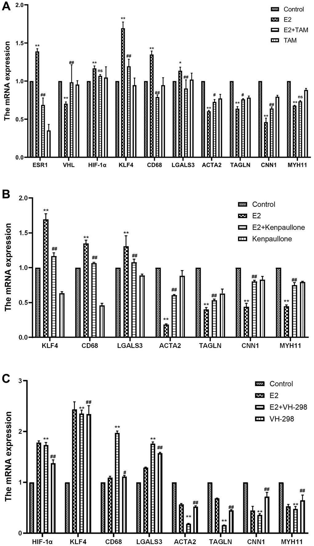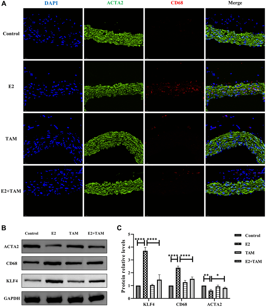 Pathological staining of the abdominal aorta of mice with HE, Masson’s trichome, and Picro-Sirius Red was performed, which demonstrated that the abdominal aorta of mice in the E2+TAM group was similar to the normal group without the pathological manifestations associated with the E2 group (Figure 2A). Compared to the E2 group, the protein expression of ACTA2 (contractile phenotype) was increased in the E2+TAM group, while the protein expression of CD68 (macrophage marker) was decreased in the E2+TAM group (Figure 3B, 3C). In addition, the expression of KLF4 was lower in the E2+TAM group compared to the E2 group (Figure 3B, 3C). And in immunofluorescence staining, TAM decreased the expression of CD68 (Figure 3A and Supplementary Figure 1B).