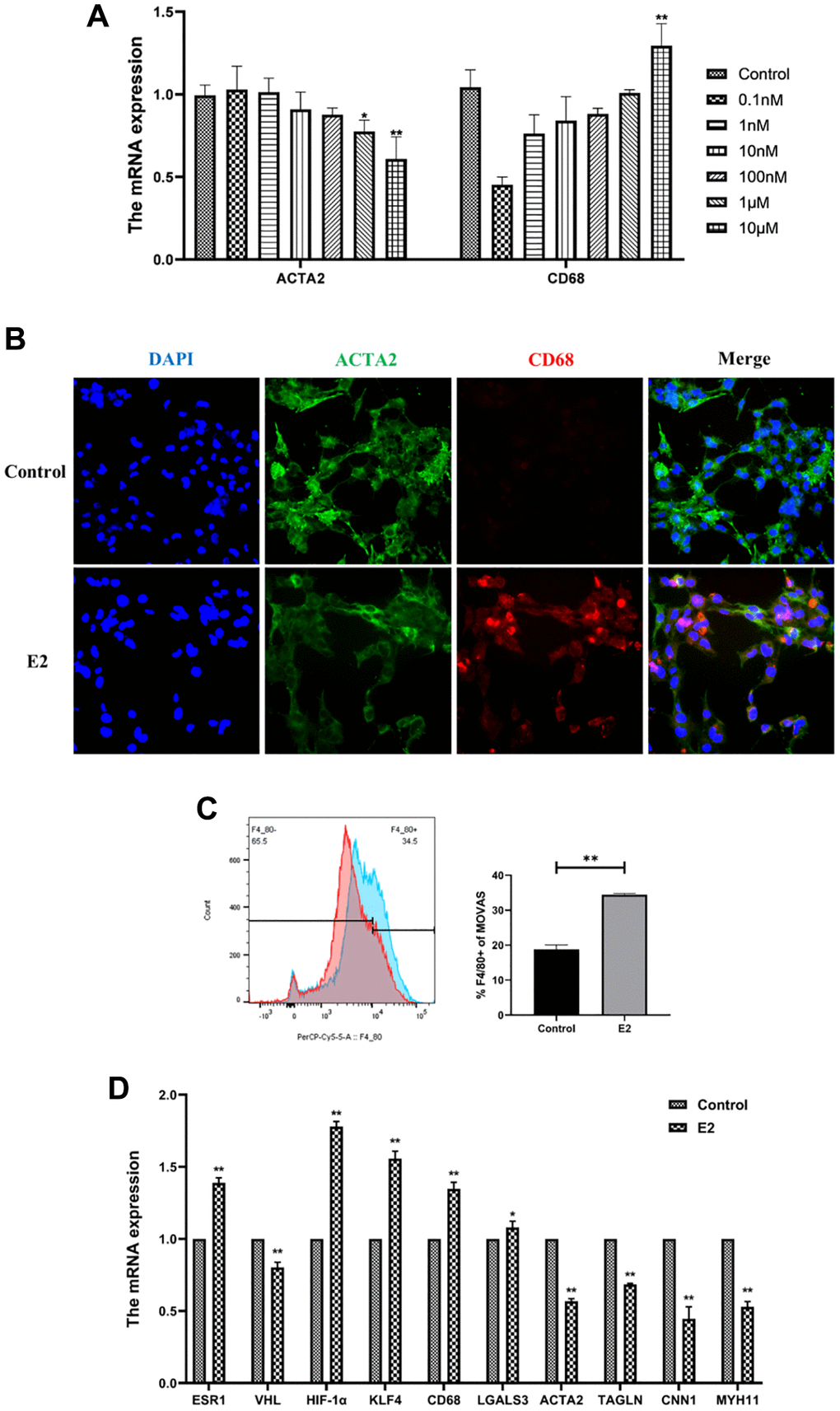 Estrogen affected the phenotype of VSMCs in a concentration- and time-dependent manner. The present study confirmed that low concentrations of estrogen maintained the contractile phenotype of VSMCs, while higher concentrations of estrogen induced significant changes in the phenotype of MOVAS cells. After treatment of MOVAS cells with 0.1 nM, 1 nM, 10 nM, 100 nM, 1 μM, and 10 μM E2 for 4 days, and the mRNA expression of ACTA2 and CD68 was detected. The results indicated that 10 μM E2 induced the phenotypic transformation of MOVAS cells (Figure 4A).
