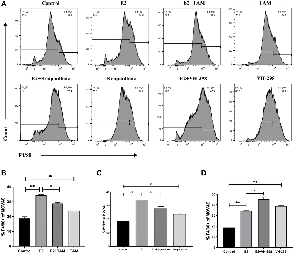 VH-298 is a highly efficient inhibitor of the VHL/HIF-α interaction, and it induces the production of HIF-1α by blocking the VHL-triggered hypoxic response, which in turn causes the accumulation of KLF4 and initiates the phenotypic transformation of MOVAS cells. Treatment of MOVAS cells with VH-298 alone decreased the expression of genes associated with the contractile phenotype but increased the expression of genes associated with the macrophage-like phenotype (Figure 5C). This promotion of phenotypic switching was enhanced by cotreatment with E2. FCM analysis demonstrated that E2+VH-298 treatment increased the percentage of F4/80+ MOVAS cells (Figure 6A, 6D).