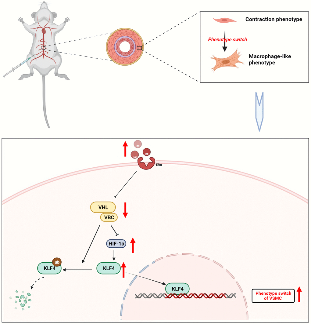 KLF4 plays a key role in VSMC phenotypic transformation. For the first time, the present study demonstrated that estrogen activated KLF4 by regulating VHL/HIF-1α, which in turn promoted phenotypic transformation of MOVAS cells. Estrogen treatment initiated the transformation of VSMCs to a macrophage-like phenotype by downregulating VHL and reducing the degradation of HIF-1α, thereby inducing the accumulation of the KLF4 transcription factor (Figure 7).