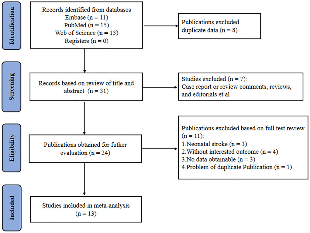 Screening was performed in two phases: initial screening based on title and abstract, followed by full-text screening of eligible articles for final inclusion. The initial database search identified 39 eligible studies. After removing the duplicates, 31 unique references were identified. The full texts of the remaining 31 records were retrieved for further assessment. Among them, 18 records were excluded because they were reviews, case reports, editorials, inadequate outcomes, neonatal ischemia, and duplicate publications. Finally, 13 studies were included in the meta-analysis (Figure 1 and Table 1) [13–18, 29–35]. Two studies intervened before stroke induction, ten intervened after ischemia induction, and one intervened before and after ischemia. Infarct size was calculated in more than 180 animals, and neurobehavioral deficits were assessed in more than 200 animals. Meta-analysis was performed based on data from 11 studies, and the effects of stroke model and treatment initiation time on infarct volume were analyzed in subgroups.