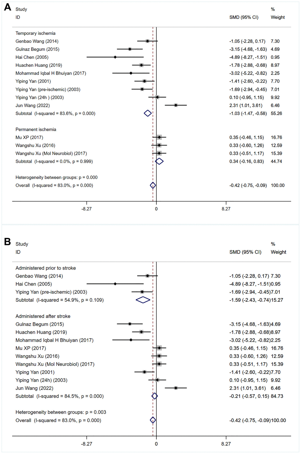 The effect of bumetanide upregulation on cerebral infarction volume was assessed in eleven studies (Table 1) [13–16, 18, 29–33, 35]. These studies measured the cerebral infarction volume by histological assessment of excised brain (tetrazolium chloride (TTC), cresyl violet) and were recorded in mm3. Meta-analysis indicated that compared with the effects of a vehicle, bumetanide significantly reduced cerebral infarction volume (SMD for overall effect: −0.42; 95% CI: −0.75 to −0.09; p = 0.000; I2 = 83%; Figure 2). Subgroup analysis showed that bumetanide reduced infarct volume in transient, but not permanent ischemic models (SMD: −1.03; 95% CI: −1.47 to −0.58; p = 0.000; I2 = 83.6% and SMD:0.34, 95% CI: −0.16 to 0.83; p = 0.999; I2 = 0%, p = 0.999 respectively; Figure 2A). Bumetanide administration after ischemia induction significantly reduced the volume of cerebral infarction relative to administration before ischemia (SMD: −0.21; 95% CI: −0.57 to 0.15; p = 0.000; I2 = 84.5% and SMD: −1.59, 95% CI: −2.43 to 0.74; p = 0.109; I2 = 54.9%, respectively; Figure 2B). Sensitivity analyses showed that the overall findings did not substantially reverse after removing any one trial, indicating that the results were reliable.