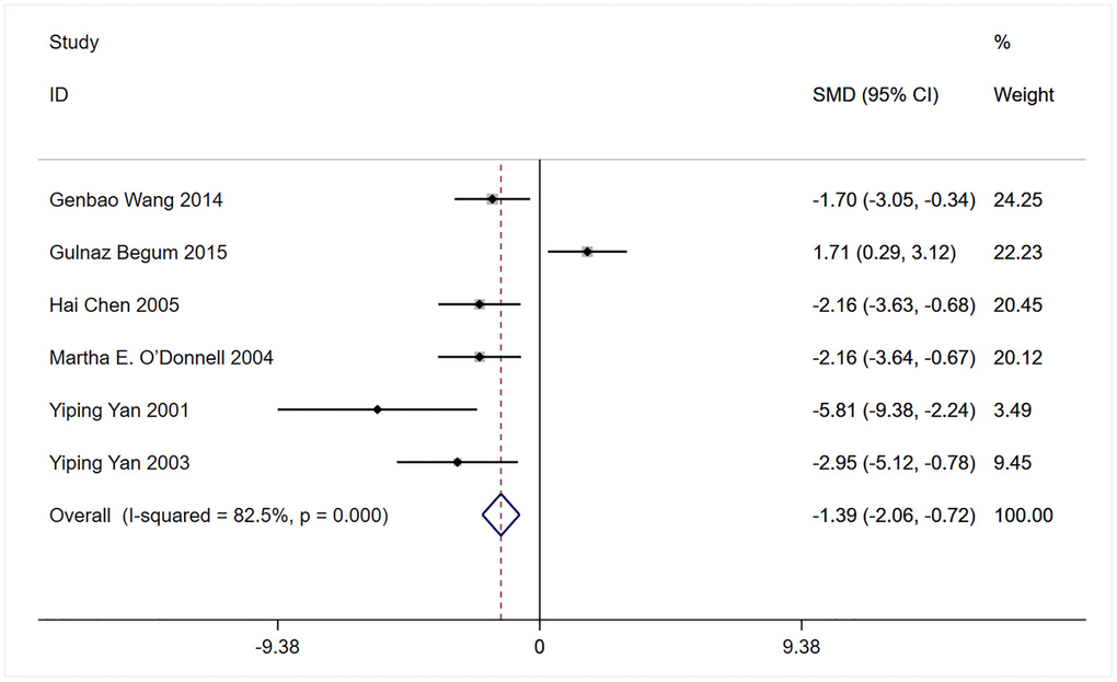Six of the 13 eligible studies, which included 64 rodents, assessed the effects of bumetanide treatment on brain edema (water content (%)) [16–18, 32, 33, 35]. A meta-analysis of findings demonstrated that brain edema was significantly lower in animals treated with bumetanide than in controls (SMD: −1.39; 95% CI: −2.06 to −0.72; p = 0.000; I2 = 82.5%; Figure 3).