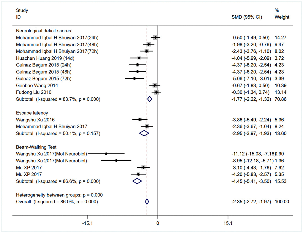 Eight studies assessed the effects of bumetanide on the neurological function in stroke models (Figure 4) [13–15, 30–34]. Two studies repeatedly assessed the neurological function during the follow-up period. Overall, bumetanide treatment was shown to have a protective effect by improving neurological function compared with the control group (SMD: −2.35; 95% CI: −2.72 to −1.97; p = 0.000; I2 = 86%). Subgroup analyses suggested that bumetanide treatment improved neurological deficit scores and limb function compared to the control group (SMD: −1.77; 95% CI: −2.22 to −1.32; p = 0.000; I2 = 83.7%; SMD: −4.45, 95% CI: −5.41 to −3.50; p = 0.000; I2 = 86.6%, respectively; Figure 4), but not improved cognitive function (SMD: −2.95; 95% CI: −3.97 to −1.93; p = 0.157; I2 = 50.1%). Moreover, the different species did not affect the improvement of neurological function (SMD: −1.77, 95% CI: −2.22 to −1.32; p = 0.000; I2 = 83.7%; Supplementary Figure 1). Sensitivity analyses showed that the exclusion of other studies did not affect the results of the overall analysis.