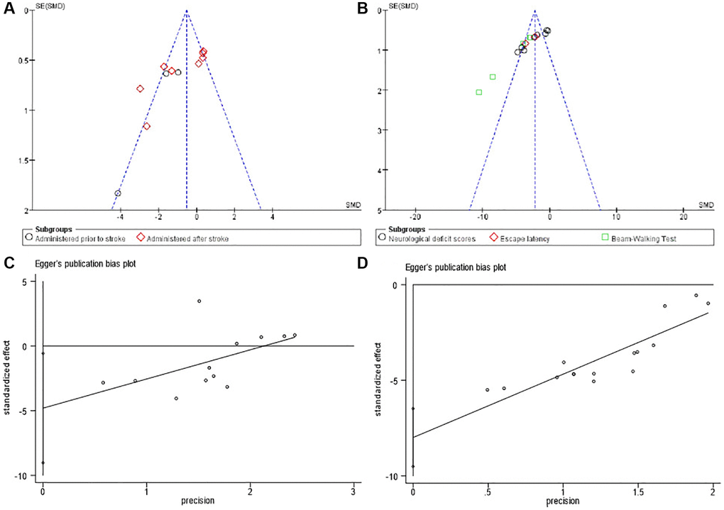 Clinical investigations have suggested that infarct size is associated with stroke severity [37]. Therefore, reducing infarct size has the potential to treat ischemic stroke. The data from the present review suggest that bumetanide promotes the recovery of infarct size. However, the possibility that bumetanide reduced infarct volume cannot be entirely attributed to reduced edema. For example, bumetanide may promote neurogenesis, strengthen existing neuronal networks, and modulate signaling. The exact mechanisms underlying the beneficial effects of bumetanide need to be fully explored in further studies to provide a new therapeutic target for reducing neurological damage that occurs after stroke. The timing of bumetanide administration is another important factor that needs to be considered. Our meta-analysis showed that bumetanide uses after the acute phase of stroke reduced the size of the cerebral infarction. However, Wang et al. showed bumetanide treatment was most effective in alleviating behavioral changes when administered 10 min before cerebral ischemia induction, and this dosing period had a larger effect size [33]. Whereas this is very difficult to transform it clinically because bumetanide cannot be administered in advance without cerebral infarction. Our meta-analysis also showed that the transient focal cerebral ischemic stroke model may exert higher efficacy because it closely mimics ischemic stroke [38]. In addition, we defined the animal model and outcome indicators before the meta-analysis, which reduced bias in the selection of the included studies. However, while 50% or more of the analyzed studies were produced in the laboratory of Dandan Sun in Pittsburgh, whose reputation is outstanding, the potential for bias was also enhanced.