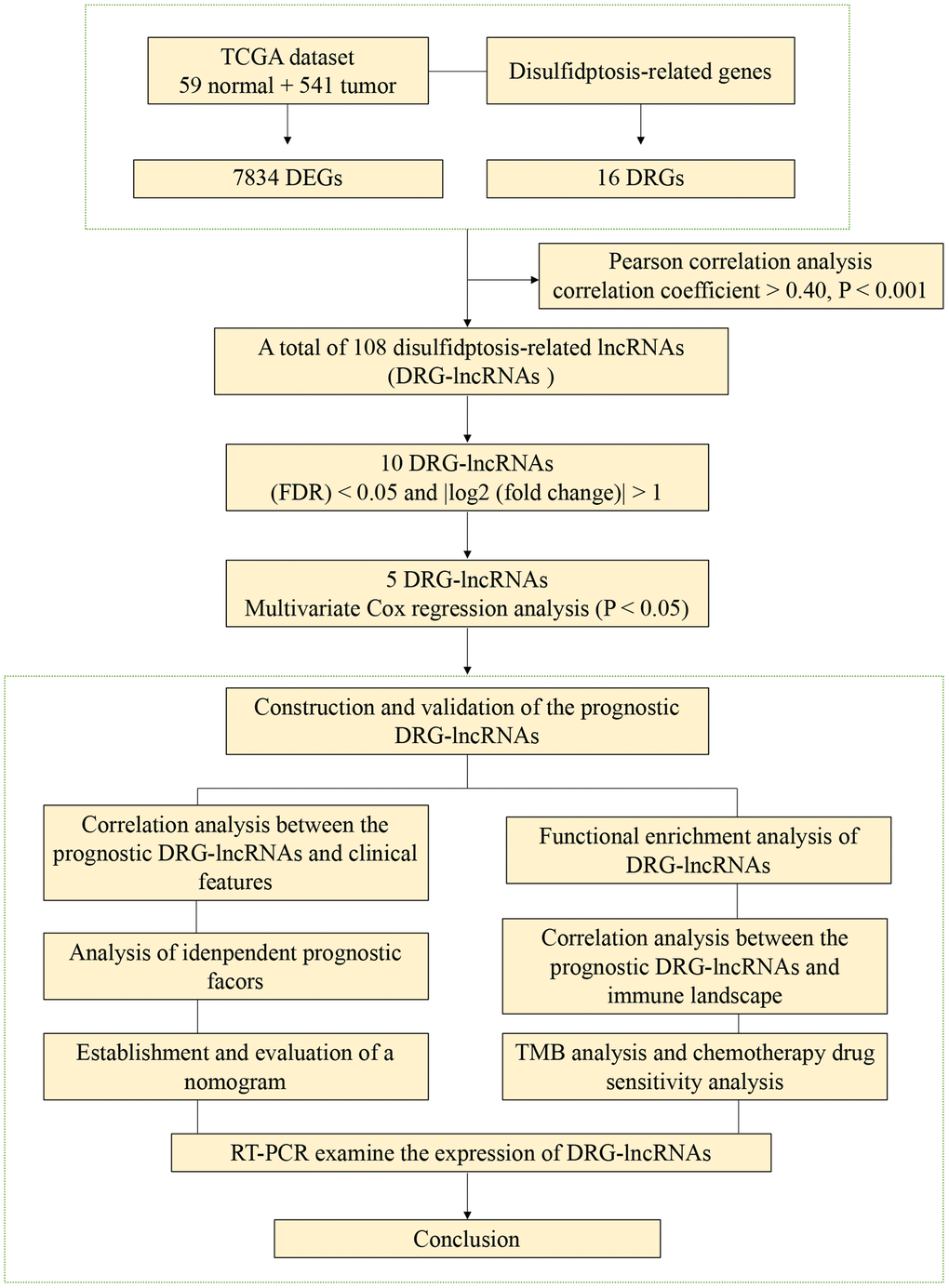 This study has some limitations. Firstly, the data source of this study was single, and the amount of data included was not large, so the analysis results may have some bias. Secondly, in order to ensure the correctness of the prognosis model, we needed to further confirm the prognosis model in other independent cohorts to ensure its accuracy. Thirdly, functional experiments should be performed to further elucidate the underlying molecular mechanisms for predicting the effects of DRG-lncRNAs.