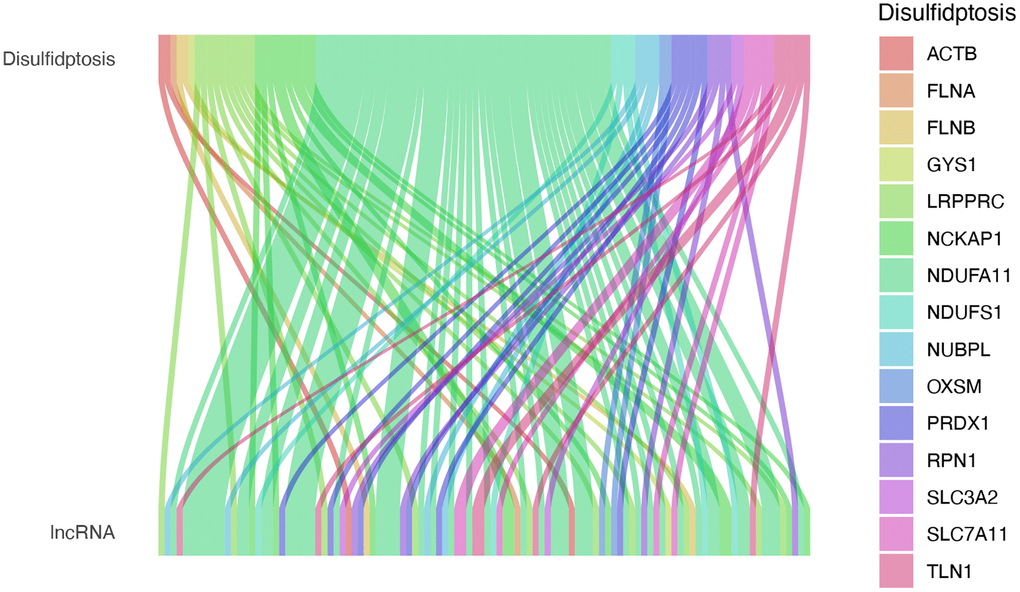 The flowchart of this study is shown in Figure 1. We analyzed the expression levels of 16 DRGs in the lung tissues of 541 LUAD patients and 59 healthy individuals downloaded from the TCGA-LUAD dataset. Subsequently, co-expression analysis was performed to identify DRG-lncRNAs (Figure 2), and a total of 108 lncRNAs significantly associated with disulfidptosis were identified (Supplementary Table 2).
