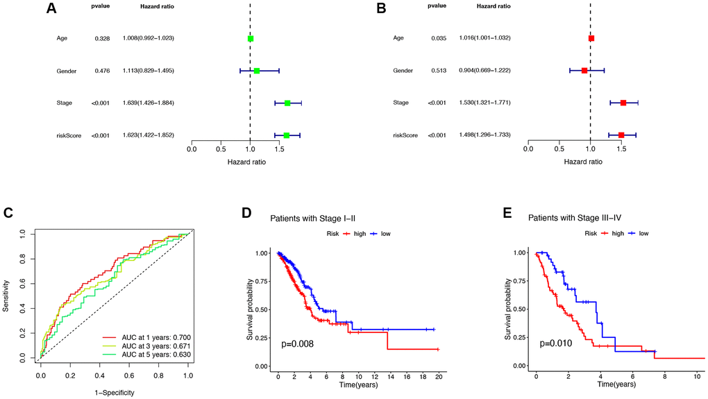 The forest plot results obtained by univariate and multivariate Cox regression analysis showed that both Stage and risk scores were independent prognostic factors in LUAD patients (P < 0.05, Figure 4A, 4B). To evaluate the accuracy of the risk score and clinical characteristics in predicting the prognosis of LUAD patients, the ROC curve results showed that the AUC of the risk score for 1 year and 3 years were 0.700 and 0.630, respectively (Figure 4C). The K-M curve results showed that LUAD patients with the same pathological grading had shorter survival times and worse prognoses with higher risk scores (P < 0.05, Figure 4D, 4E). This indicated that the model had certain reliability and accuracy in predicting the prognosis of LUAD patients.