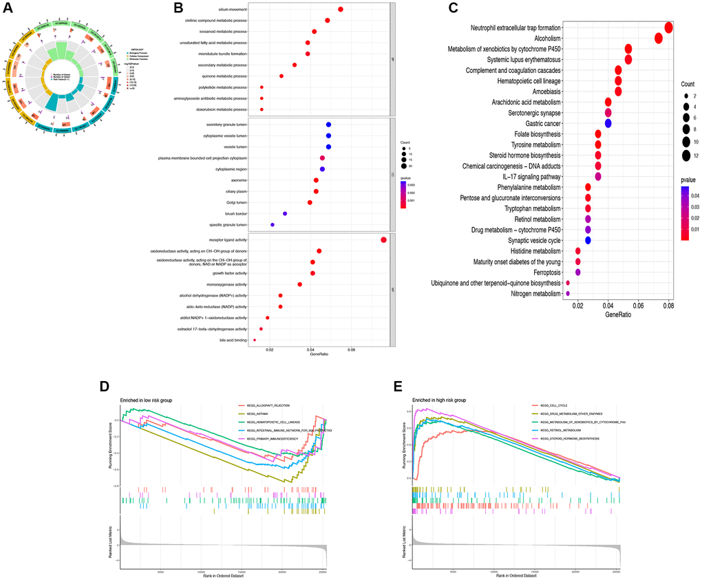 To investigate the mechanisms underlying the impact of DRG-lncRNAs characteristics on LUAD prognosis, this study conducted GO and KEGG enrichment analyses on lncRNAs based on high/low-risk scores. GO analysis showed that the cilium movement, secretory granule lumen, and receptor-ligand activity were the richest terms in biological processes (BP), cellular components (CC), and molecular functions (MF) (Figure 5A, 5B). The KEGG enrichment analysis showed that multiple pathways were associated with DRG-lncRNAs features (Figure 5C). The GSEA subsequently uncovered that the low-risk group was enriched in asthma and the high-risk group was enriched in steroid hormone biosynthesis (Figure 5D, 5E).