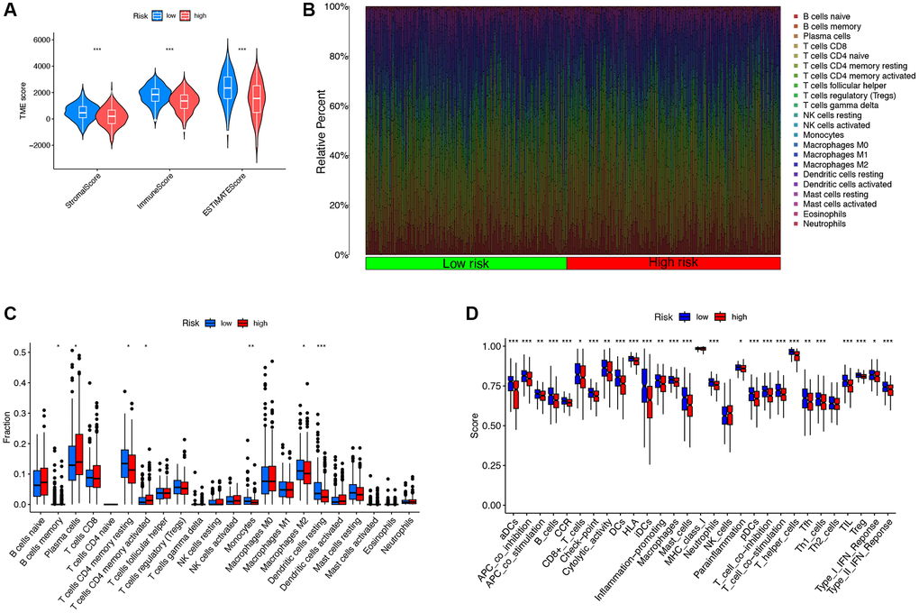 We assessed tumor-infiltrating immune cells by EPIC algorithms, CIBERSORT-ABS, MCP-counter, XCELL, QUANTISEQ, CIBERSORT, and TIMER. We also compared immune checkpoints and drug sensitivity from the high-risk and low-risk groups. Furthermore, we quantified the differences in TME scores and immune-related gene expression between the two risk groups.