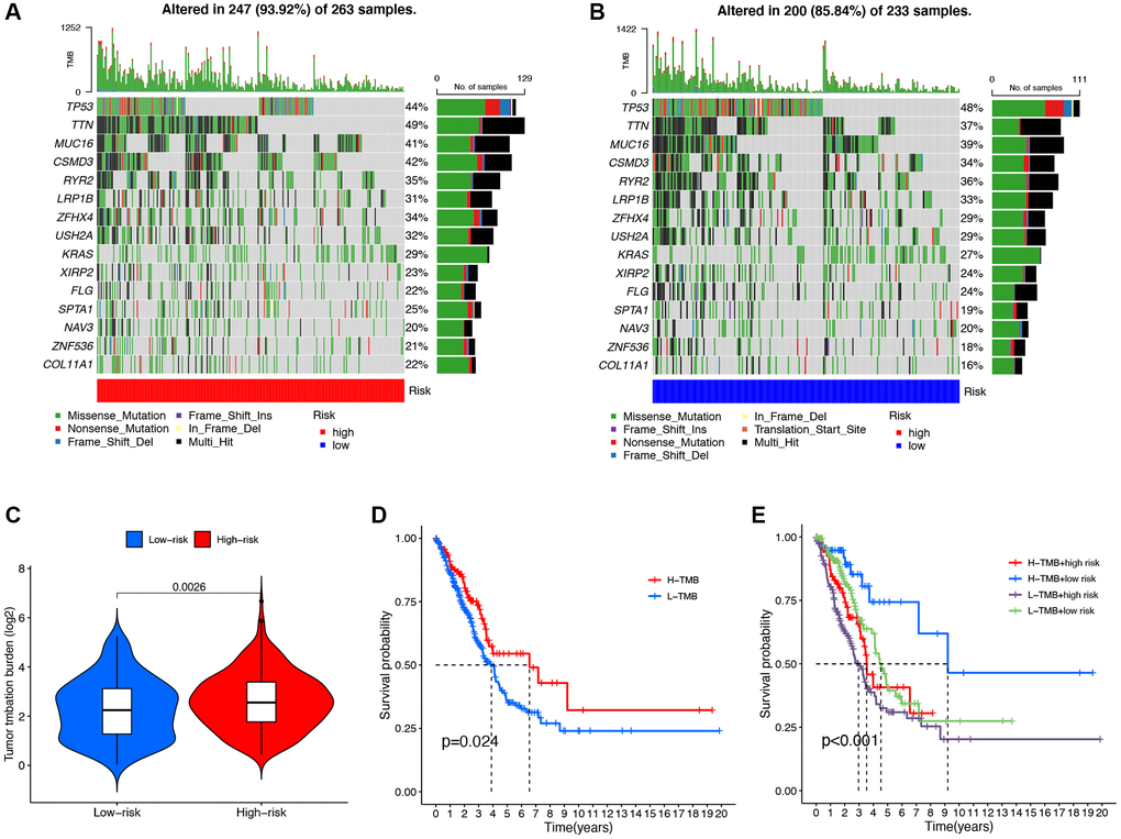 We analyzed the mutation data of the TCGA dataset and displayed the mutation information of each gene in the sample through a waterfall plot. We compared the top 20 mutated genes in the high-risk group (Figure 7A) and the low-risk group (Figure 7B), among which TP53 (44% vs. 48%), TTN (49% vs. 37%), MUC16 (41% vs. 39%), and CSMD3 (42% vs. 34%) were the most common mutated genes. Compared with the low-risk group, the frequency of mutations was higher in the high-risk group (93.92% vs. 85.84%). In addition, there was a significant increase in TMB levels in the high-risk group compared to the low-risk group (P = 0.0026, Figure 7C). The Kaplan-Meier survival analysis demonstrated a significant increase in OS among LUAD patients in the high TMB group compared to the low TMB group (P = 0.0026, Figure 7D). In the high TMB and low-risk group, the OS of LUAD patients significantly increased (Figure 7E).