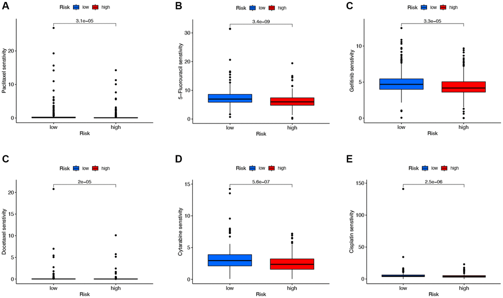 To explore chemotherapeutic drugs that may be sensitive to LUAD patients, this study used the R software package based on the GDSC2 database to determine the IC50 of chemotherapy drugs and performed drug sensitivity analysis (Figure 8). The results showed that compared with the low-risk group, the IC50 values of Paclitaxel, 5-Fluorouracil, Gefitinib, Docetaxel, Cytarabine, and Cisplatin were significantly reduced in the high-risk group. These results indicate that Paclitaxel, 5-Fluorouracil, Gefitinib, Docetaxel, Cytarabine, and Cisplatin may be sensitive chemotherapeutic drugs for treating LUAD patients with high risk.
