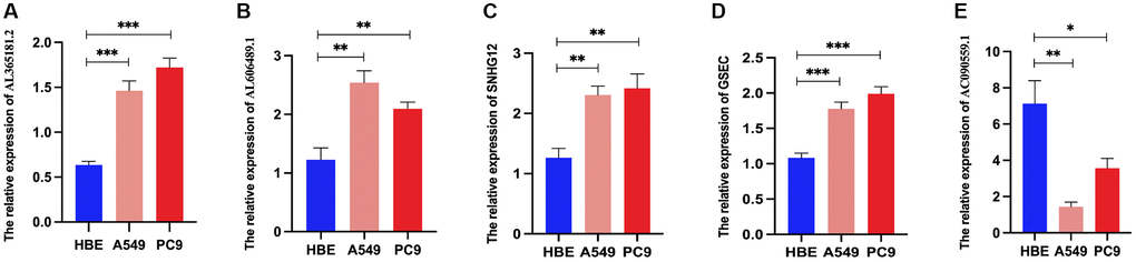 Then, we examined the expression of DRG-lncRNAs in a panel of LUAD cell lines (A549 and PC9) and the human bronchial epithelial cell line (HBE) by RT-PCR. Compared with the HBE, the expression of AL365181.2, AL606489.1, SNHG12, and GSEC was increased in LUAD cell lines (Figure 9A–9D), and AC090559.1 was decreased in LUAD cell lines (Figure 9E).