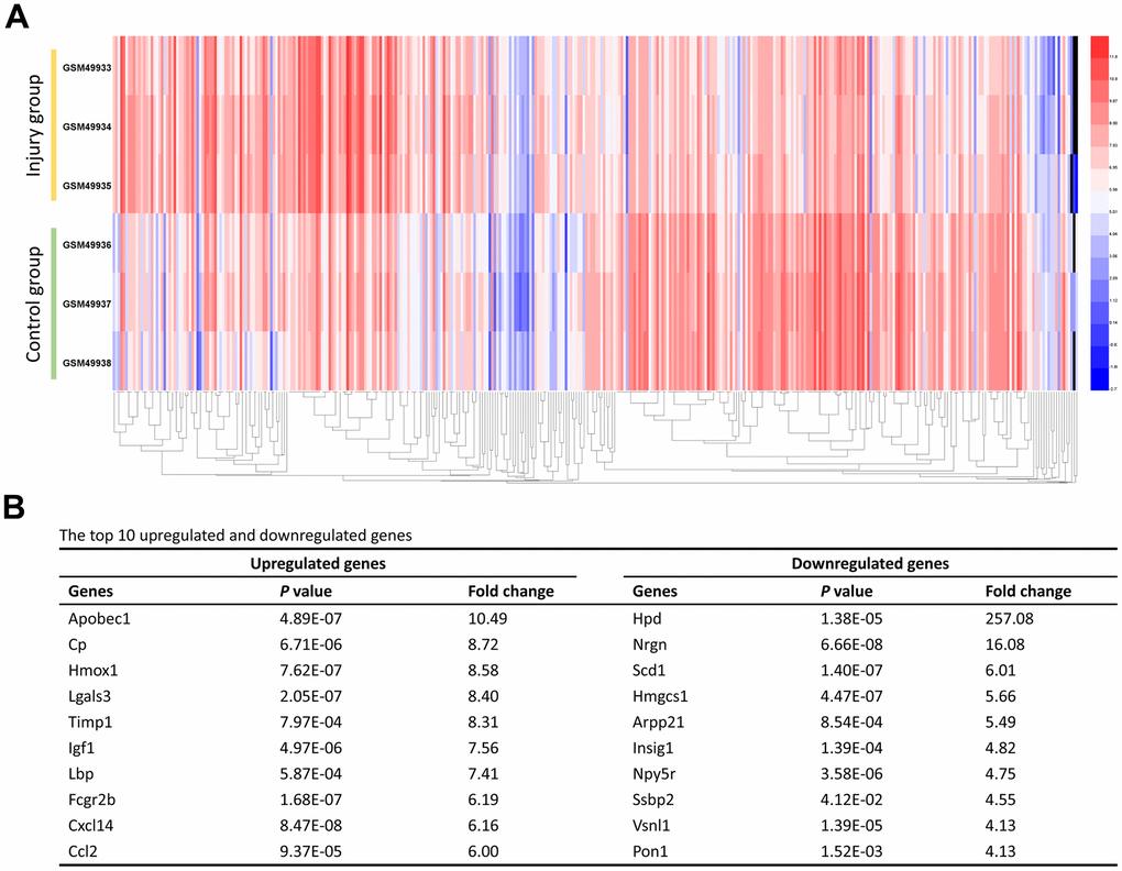 We initially retrieved gene expression profile (GSE2599) from the GEO database. A total of 416 DEGs expressed in contusion injured spinal cord samples were extracted from the database. Expressions of 206 genes (49.52%) were down-regulated and 210 genes (50.48%) were up-regulated in comparison to uninjured spinal cord samples. Subsequently, the heat map of the DEGs was generated to visualize their expression levels across various samples (Figure 1A). Furthermore, the top 10 up-regulated and down-regulated genes were list in Figure 1B.