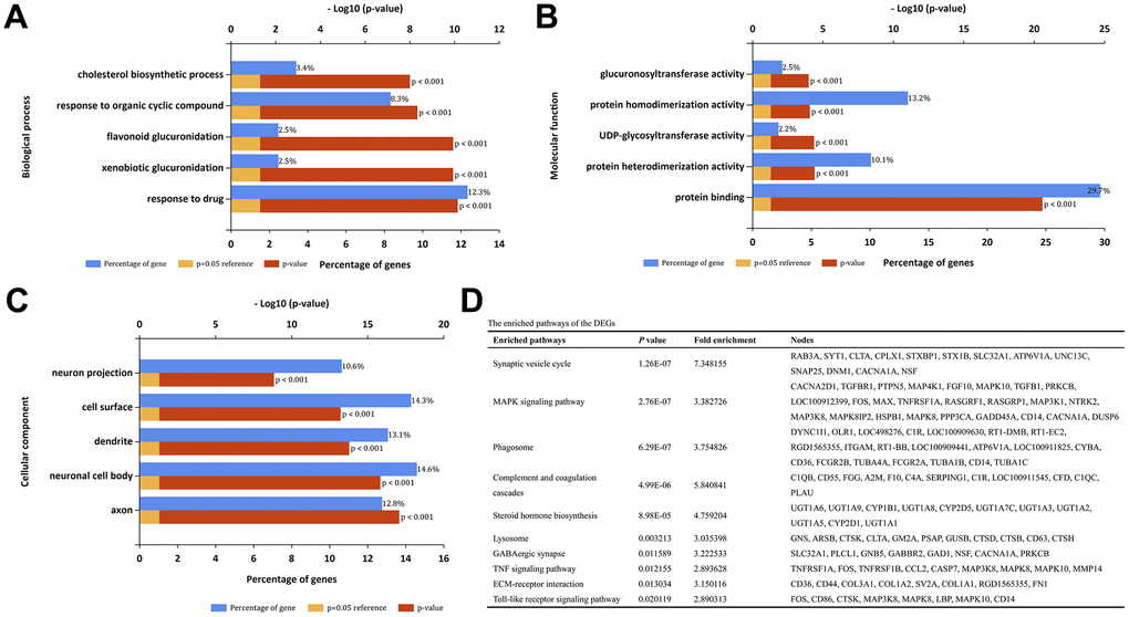 DAVID was used to perform GO term and KEGG pathway enrichment analysis for the identified DEGs. GO analysis results showed that for biological processes (BP), the DEGs were significantly enriched in cholesterol biosynthetic process, response to organic cyclic compound, flavonoid glucuronidation, xenobiotic glucuronidation and response to drug (Figure 2A). For molecular function (MF), the DEGs exhibited significant enrichment in the processes related to glucuronsyltransferase activity, protein homodimerization activity, UDP-glycosytransferase activity, protein heterodimerization activity and protein binding (Figure 2B). For cell components (CC), the DEGs exhibited significant enrichment in the processes related to neuron projection, cell surface, dendrite, neuronal cell body and axon (Figure 2C). Moreover, the top ten KEGG pathways were listed in Figure 2D, including synaptic vesicle cycle, MAPK signaling pathway, phagosome, complement and coagulation cascades and so on.