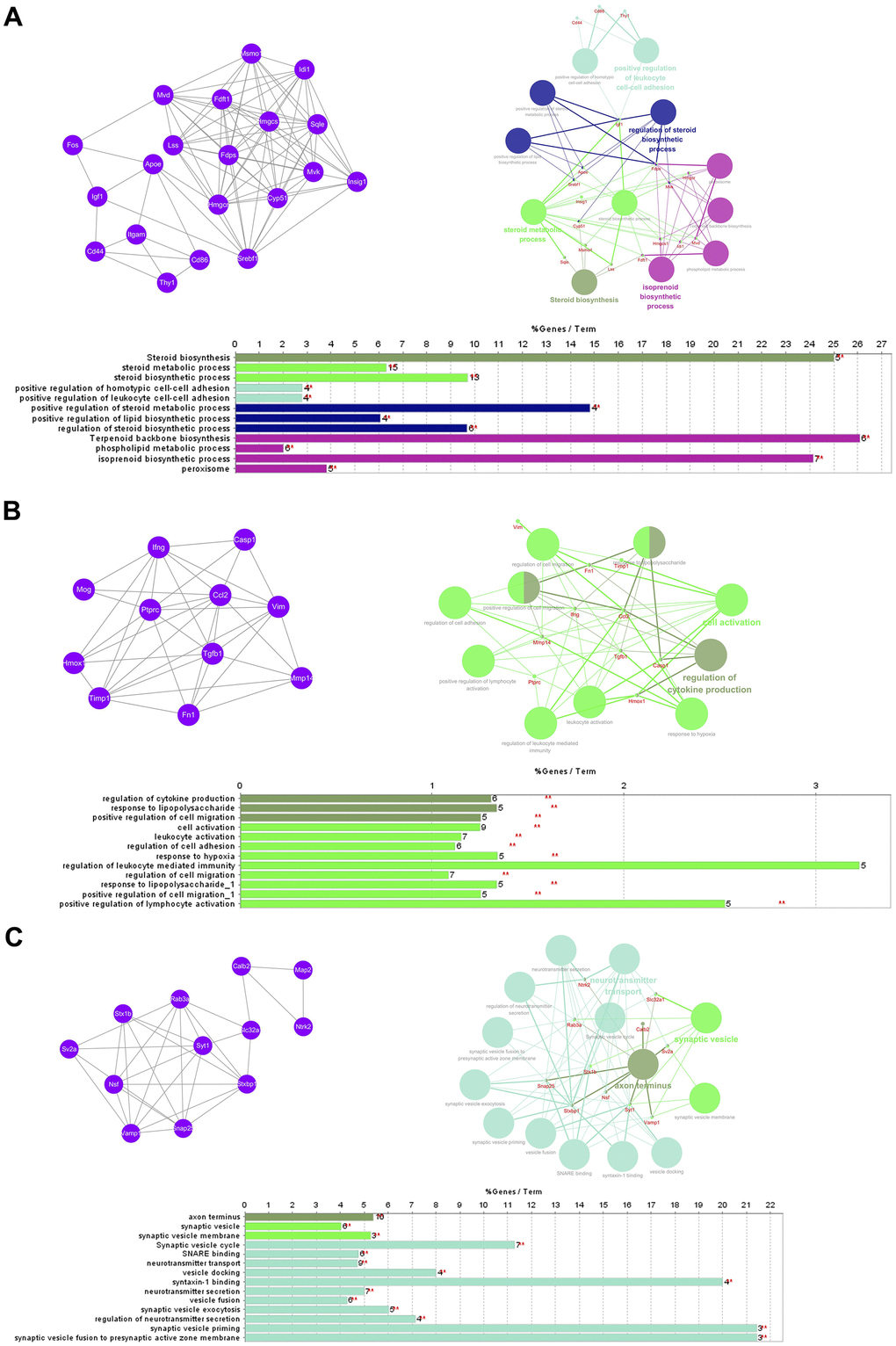Search Tool for the Retrieval of Interacting Genes (STRING) database was used to further illustrate the interactive relationships among the DEGs. We utilized Cytoscape software to analyze the PPI network, focusing on interactions that have been experimentally validated and possess a confidence score exceeding 0.4. We used MCODE to screen the modules of the PPI network [45]. A network that is scale-free exhibits a distribution of vertex connectivity that adheres to a power law, characterized by a scarcity of highly connected vertices (high degree) and an abundance of vertices with low degrees The PPI network analyzed in this study exhibited the property of scale-free networks, which is indicative of a node degree distribution that closely follows a power-law distribution [46]. Three highest-degree modules were extracted, and the enrichment of functions of each module were analyzed with ClueGO.