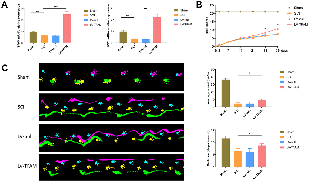 We chose IGF1 and its predicted transcription factor, TFAM for the further study. To confirm the expression of IGF1 and TFAM, we performed qRT-PCR, and the results detected that IGF1 and TFAM was significantly down-regulated after SCI (Figure 5A). We then locally injected LV-TFAM into the injured spinal cord, and the qRT-PCR results showed that IGF1 and TFAM were significantly up-regulated in LV-TFAM group. At the time points of 2, 7, 14, 21, 28 and 35 days post-injection, Basso, Beattie and Bresnahan (BBB) scale was performed for assessing motor recovery of rats hind limbs after SCI. and the results showed that after overexpression of TFAM, the BBB scores were clearly increased (P < 0.05) (Figure 5B). At 35 days post-injection, motor recovery after SCI was assessed using the Noldus CatWalk XT system. These observations demonstrated that there were significant differences between the injury group and TFAM-overexpression group in average speed and cadence (steps/second). The rats in the LV- TFAM group displayed faster speed and cadence, possibly indicative of motor recovery (Figure 5C). In all, the results showed a significant recovery in the TFAM-overexpression group compared to the injury group.
