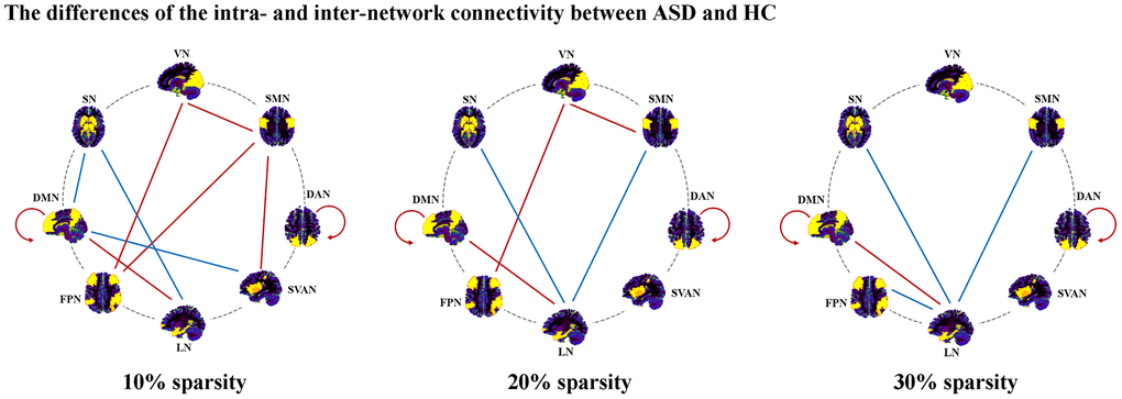 Through these sparsities, ASD exhibited increased inter-network connectivity in LN-SN, decreased inter-network connectivity in LN-DMN, and decreased intra-network connectivity within DAN and DMN.