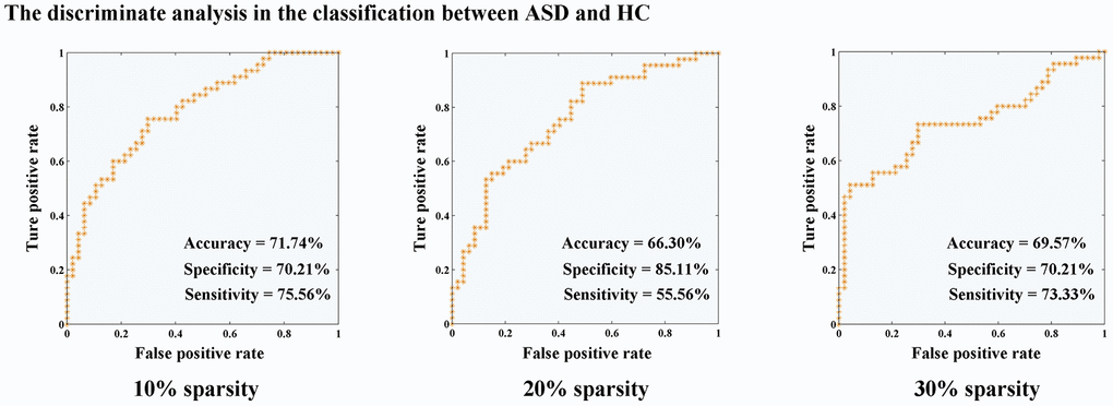 Disease classification is made by SVM analysis. There are 3 stages in SVM protocol: feature selection, classifier training, and prediction [23]. SVM initiates by selecting relevant features to construct a reproducing kernel hilbert space (RKHS) for classification purposes. In this study, we specifically identified statistically significant features linked to inter- and intra-network connectivity to be utilized in our SVM model. Subsequently, the SVM algorithm proceeds to train a classifier by constructing an optimal hyperplane that effectively discriminates between different classes classifier which is utilized for predicting the class label of any newly introduced sample. The SVM analysis was performed using the LIBSVM toolkit5 in this study. We utilized leave-one-out cross-validation (LOOCV) to mitigate the issue of a small sample size for assessing mean accuracy rate in distinguishing individuals diagnosed with ASD from HC [24, 25]. The classifier can be assessed through area under the receiver operating characteristic (ROC) curve, specificity, and sensitivity based on cross-validation results. It is worth noting that specificity reflects the accuracy in correctly predicting healthy control subjects, while sensitivity represents the accuracy in correctly identifying individuals with ASD.