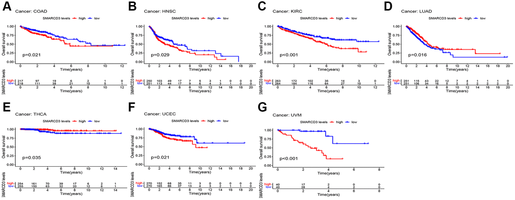 Using univariate Cox analysis, the associations between the expression level of SMARCD3 and clinicopathological characteristics and survival (including overall survival (OS), disease-specific survival (DSS), disease-free survival (DFS) and progression-free survival (PFS)) in 33 cancer types were examined. Survival rates were compared between groups with high and low SMARCD3 expression using Kaplan-Meier curves.