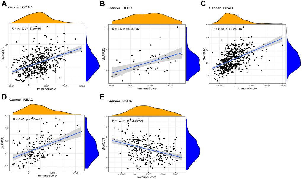 Next, we evaluated the relationships of SMARCD3 with the ImmuneScore and StromalScore in different cancers. Notably, SMARCD3 was negatively correlated with the immune score in SARC patients and was positively correlated with the stromal score, immune score and ESTIMATEScore in COAD, PRAD, and READ patients. A study focused on the CD2 gene of breast cancer revealed that patients with high immune scores had improved OS, proving that the immune component of the immune microenvironment is a potential favorable factor in terms of the prognosis of BRCA patients [30]. The same results were obtained in a study of colorectal cancer [31]. The CIBERSORT algorithm derives links between target genes and immune cells in some specific cancers. The analysis of SMARCD3 and immune-related genes, revealed it is connected to a variety of immune-related genes. For example, in PRAD, SMARCD3 is positively correlated with CD40, and CD40 has been shown to be active in B cells and myeloid cells with high SMARCD3 expression [32]. In UCS patients, SMARCD3 was negatively correlated with HLA-DMB and TAPBR. HLA-DMB has been shown to affect antigen presentation and activation in CD4+ T cells [33].