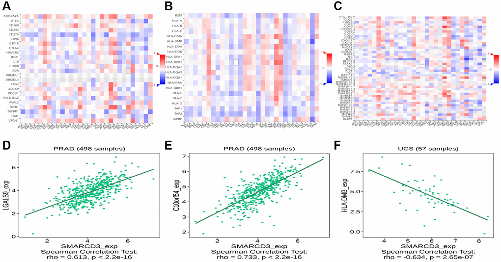 We used TISIDB online tools to determine the associations between SMARCD3 and immune-related genes. The results revealed that SMARCD3 was significantly correlated with multiple immune-related genes. In the analysis of immunoinhibitors, SMARCD3 showed a positive correlation with LGALS9 and C10orf54 in PRAD, was positively correlated with TGFβ1 in READ, and demonstrated a negative correlation with CD274 and BTLA in MESO and UCS, respectively. According to the immunostimulatory analysis, SMARCD3 target genes were negatively correlated with LTA and IL6R in TGCT and positively correlated with CD40 in PRAD. Finally, in the MHC molecule analysis, target genes showed a positive correlation with HLA-DPB1 in both the PRAD and READ cohorts but demonstrated a negative correlation with HLA-DMB and TAPBR in the UCS cohort (Figure 4). The remaining relevant genes are shown in Supplementary Figure 11.