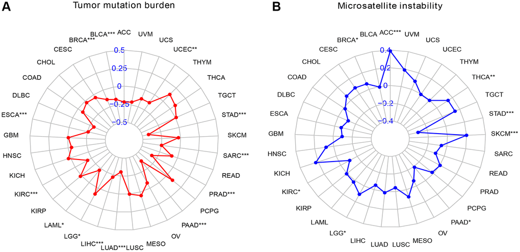TMB indicates the number of mutations in tumor samples, and the level of TMB affects the impact of immunotherapy and the immune response of malignancies [18]. In MSI, the DNA sequence changes in tumor cells due to the deletion or insertion of microsatellite DNA repeats [19]. MSI is associated with a response to tumor immunotherapy. The TCGA database provides TMB and MSI data.