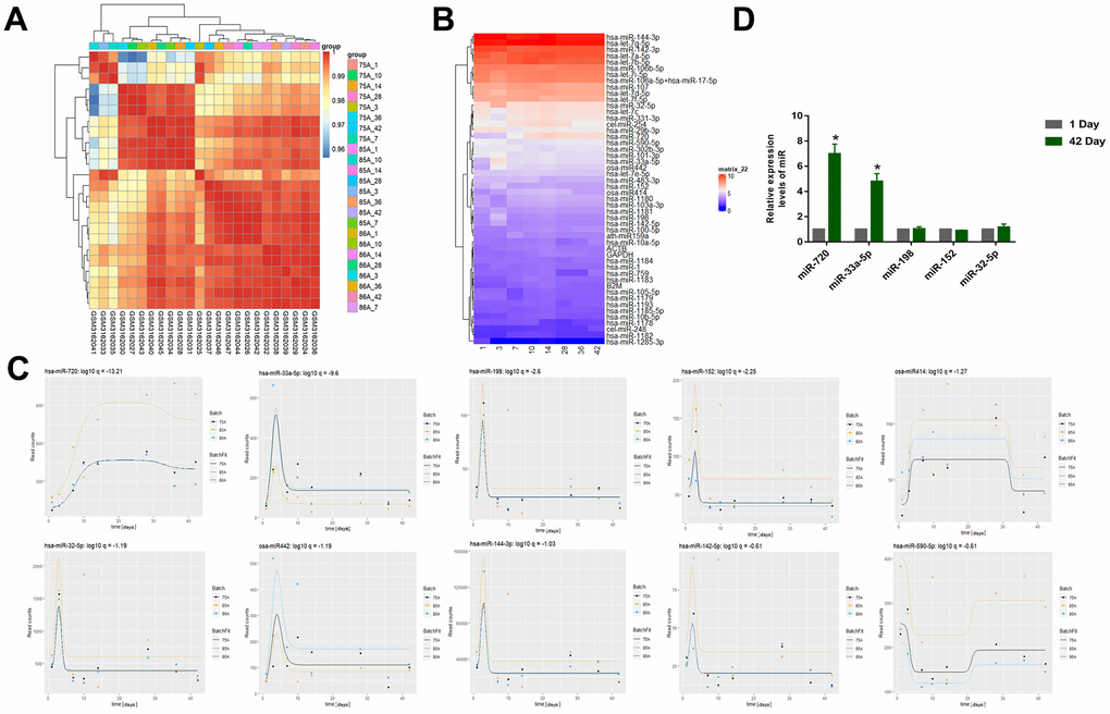 Differences in stored blood RBC miRNAs were determined by gene expression data analysis and significantly changed miRNAs with longer storage times were determined by timing analysis (GSE114990). The relatedness of the different samples in the dataset were evaluated for subsequent analyses (Figure 1A). The differences in the miRNA expression levels between samples in the different groups was also demonstrated (Figure 1B). The top ten differentially expressed miRNAs were miR-720, miR-33a-5p, miR-198, miR-152, miR414, miR-32-5p, miR442, miR-144-3p, miR-142-5p, miR-590-5p (Figure 1C). Some metabolic substances gradually increase in the first two weeks under the action of oxidative stress during blood storage and significantly decrease after 14 days [25, 26], which was similar to our results. They reached a peak on the 10th day and then decreased rapidly. Then we validated the expression of the top five miRNAs using qRT-PCR of the RBC samples we collected from the donors (Figure 1D). The results showed that only miR-720 and miR-33a-5p levels were significantly elevated. However, over time, the level of miRNA in the circulation will significantly degrade, while the level of miR-720 did not significantly decrease and remained higher than the normal group after 10 days, indicating that it was not a conventional miRNA. Therefore, we chose miR-33a-5p as a follow-up study.