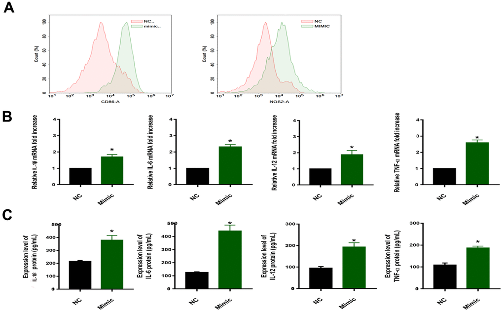 To verify this hypothesis, the Flow cytometry and qRT-PCR were performed on macrophages (induced by THP-1 with PMA) transfected with the miR-33a-5p mimic. Polarized macrophages were characterized by their differential expression of CD surface markers and cytokine secretion. We selected CD86 and NOS2 (generally considered as regulatory genes for M1 polarization of macrophages) [23, 24] to judge the effect of miR-33a-5p on macrophage polarization. Compared with non-transfected normal macrophages (NC), macrophages transfected with the miR-33a-5p mimic (Mimic) expressed more CD86 and NOS2, resulting in the M1 type polarization (Figure 3A), as well as the mRNA (increased 1-2 times) (Figure 3B) and the protein levels of the release of inflammatory factors IL-1β, IL-6, IL-12, and TNF-α (increased 1-4 times) (Figure 3C).