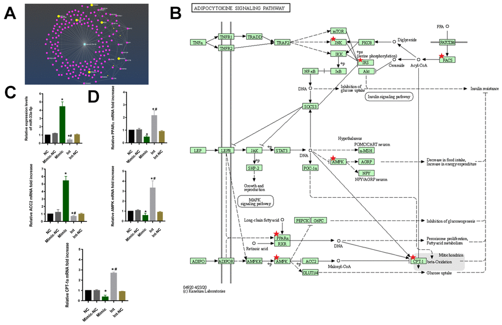 To investigate the regulatory mechanism of miR-33-5p in macrophage M1 polarization, the regulated target mRNA genes of miR-33a-5p were screened. The R package, and miRNetR were used for the targeted mRNA genes of miRNA (Figure 4A). And the KEGG enrichment analyses showed that the target mRNA genes were enriched in the adipocytokine signaling pathway and the PPARα/AMPK/CPT-1a pathway was the key signaling pathways (Figure 4B).
