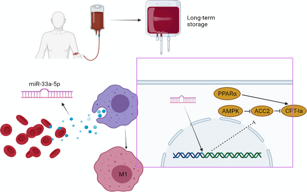 In conclusion, we demonstrated that miR-33a-5p mediates the crosstalk between inflammatory factor accumulation in stored blood and macrophages. This contributed to the activation of M1 macrophages through the PPARα/ACC2/AMPK/CPT-1a pathway. Our study indicates that miR-33a-5p may represent a novel target for the prevention of the progression of transfusion-related adverse reactions and may be a new biomarker for evaluating the quality of RBC units.