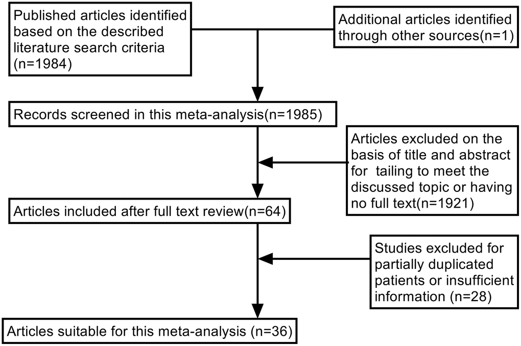Figure 1 demonstrates that 36 studies met the inclusion criteria and were enrolled for analysis of the prognostic value of E-cad expression, as well as its association with clinical characteristics and risk factors for GC (of the 1985 publications, 1921 studies were excluded due to incomplete content, 16 were excluded because they lacked sufficient data to calculate OS, and 12 were excluded as their data overlapped with those of other studies).
