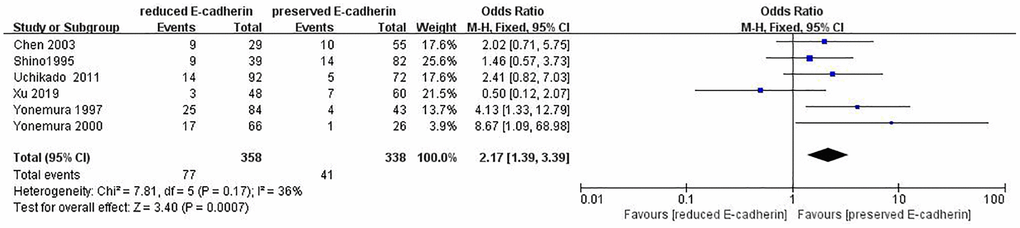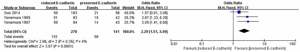 Table 3. Subgroup analysis for E-cadherin expression with OS and lymphatic node metastasis in GC.