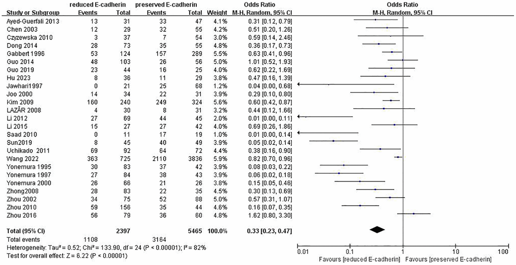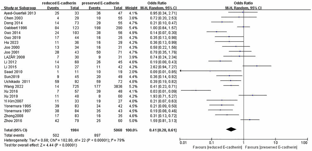 The articles published before June 30, 2023 in the PubMed, Elsevier, Embase, Cochrane Library, and Web of Science databases were systematically searched. The terms used in the search were as follows: “E-Cadherin”, “prognosis”, and “stomach neoplasms”. The reference lists of publications were retrieved by manual. Only English-language studies were encompassed in the selection process.