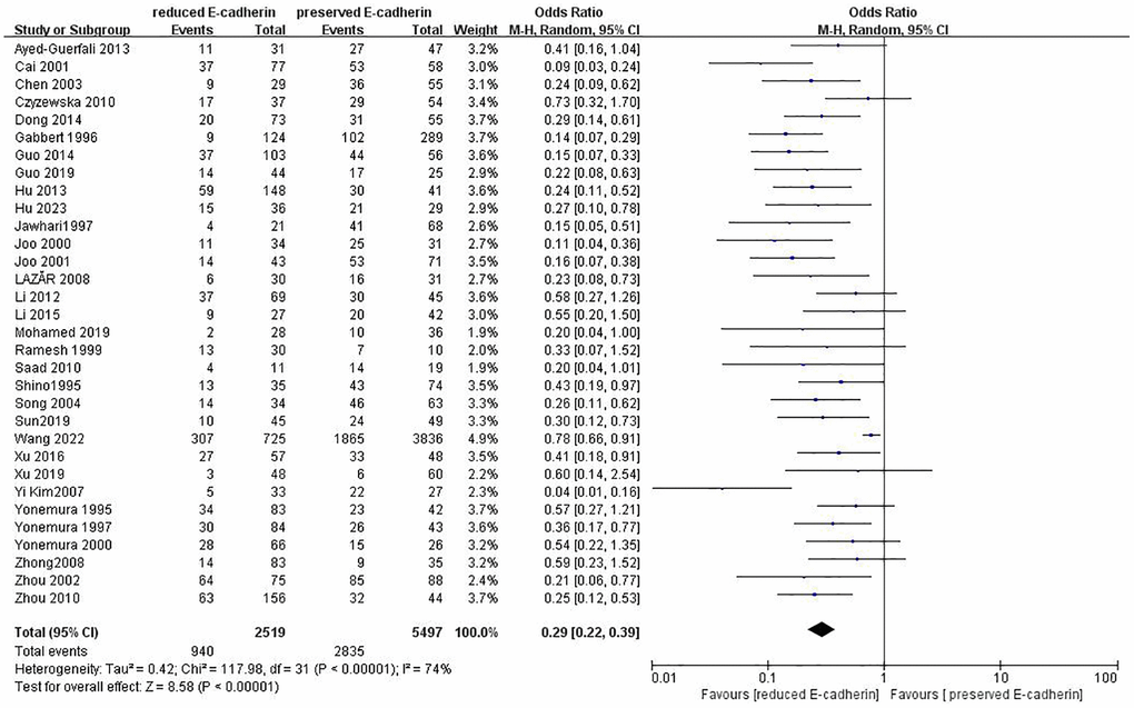 However, the median survival is within 12 months. It is demonstrated that E-cad is crucial for tumor development, invasion, metastasis in GC. There is no consensus about impact of E-cadherin expression on prognosis and clinical characteristics of patients with GC. In this meta-analysis 9048 cases from 36 eligible studies were analyzed to elucidate its correlation.